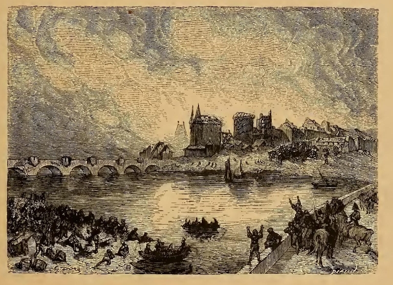 At sunrise, when they had loosed the five drowned men from the arches, they cast all the Bayonnais upon the current of the stream, and said that they might go down thus to their sea, and that this cartful of dead flesh was such toll as the Basques would pay. The congealed wounds were opened again by the coldness of the water; it was a fine sight: by means of the blood that flowed, the river blushed red as a morning sky.