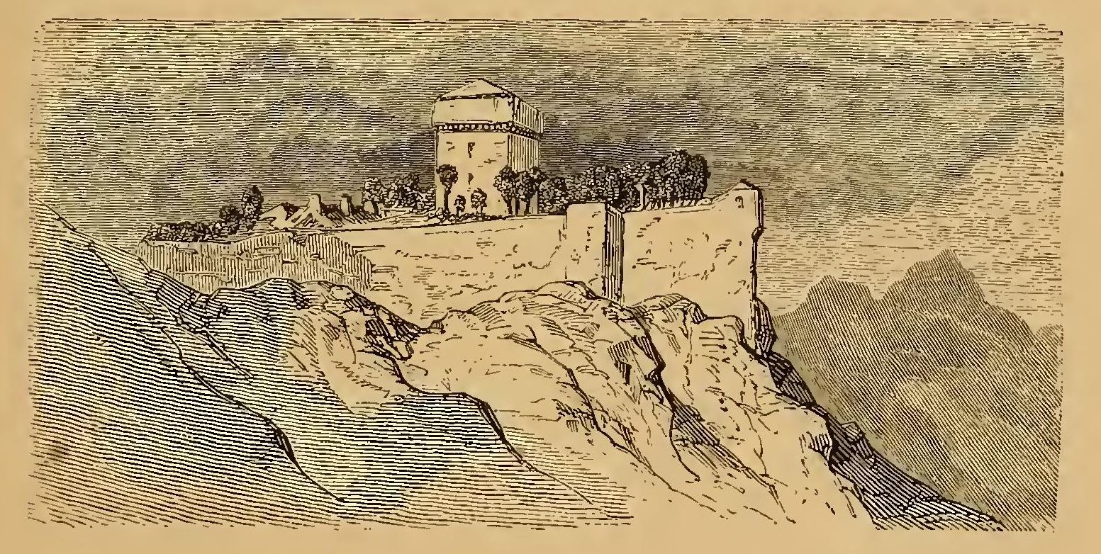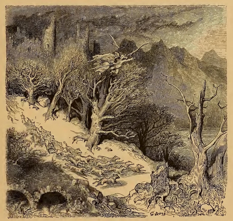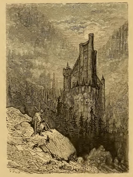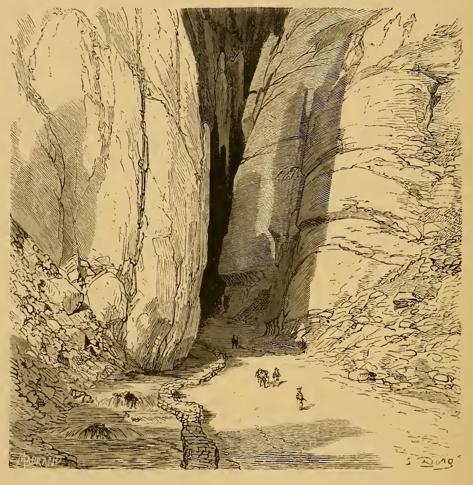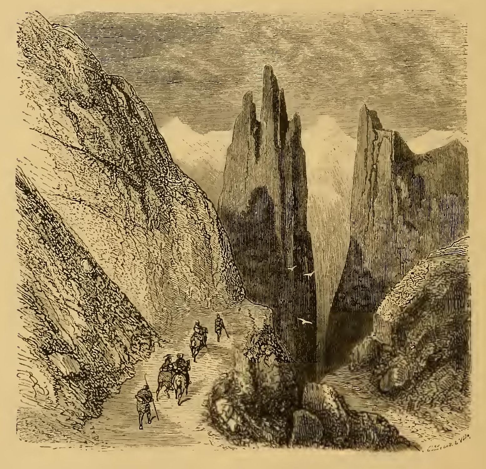 Very near here, on a round eminence of bare rock, rises the ruin of a Moorish tower, named Cas-tel-Vieil. Its side is bordered with a frightful mountain, black and brown, perfectly bald and resembling a decayed amphitheatre; the layers hang one over another, notched, dislocated, bleeding; the sharp edges and fractures are yellowed with wretched moss, vegetable ulcers that defile with their leprous patches the nudity of the stone. The pieces of this [498]monstrous skeleton hold together only by their mass; it is crannied with deep fissures, bristling with falling blocks, broken to the very base; it is nothing but a ruin dreary and colossal, sitting at the entrance of a valley, like a battered giant.
