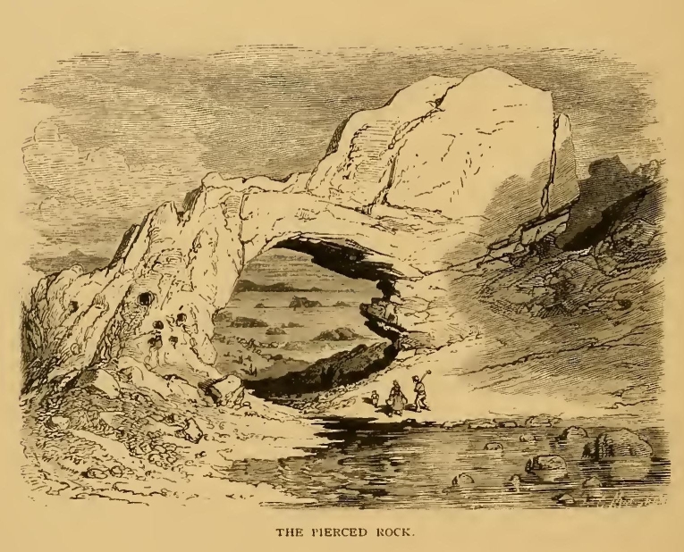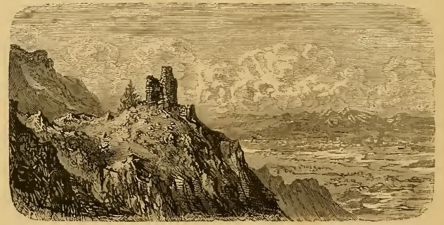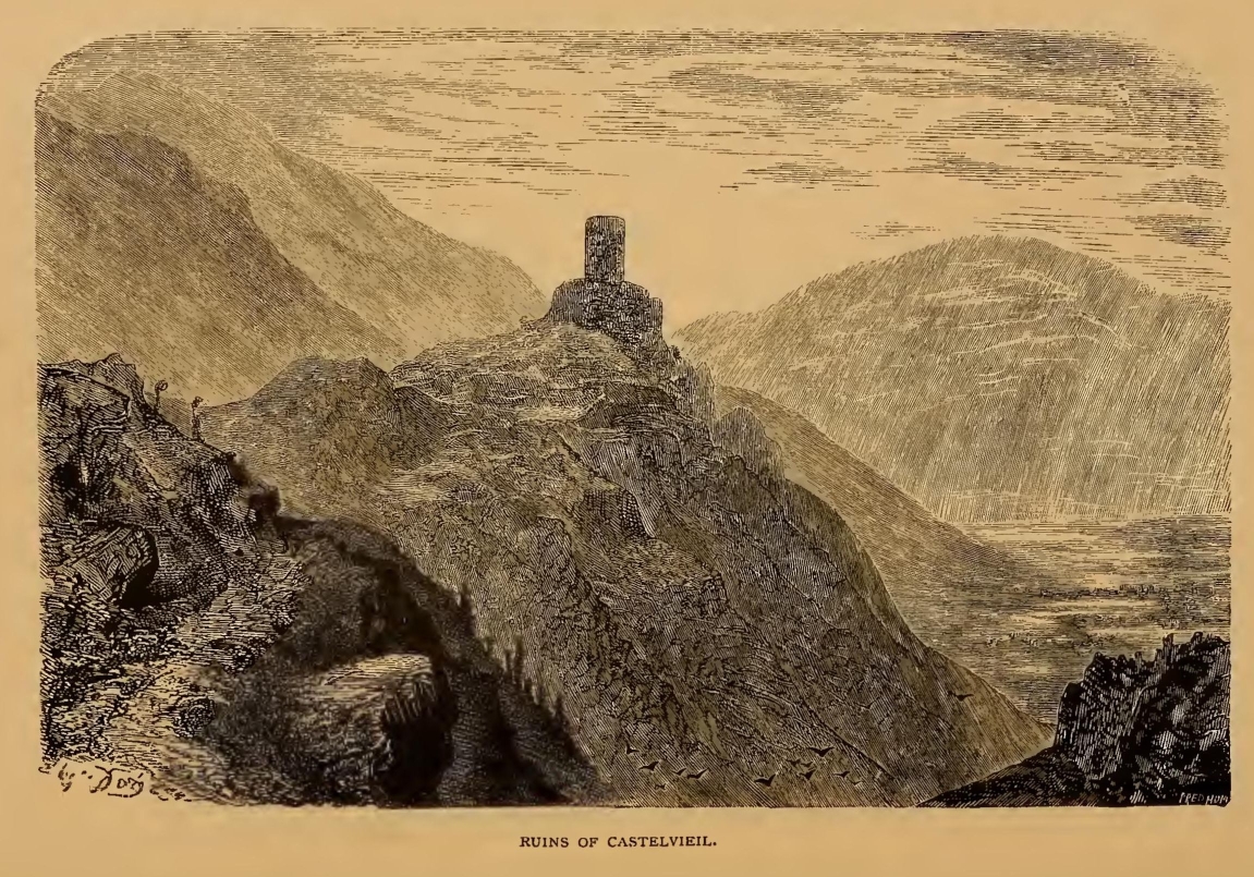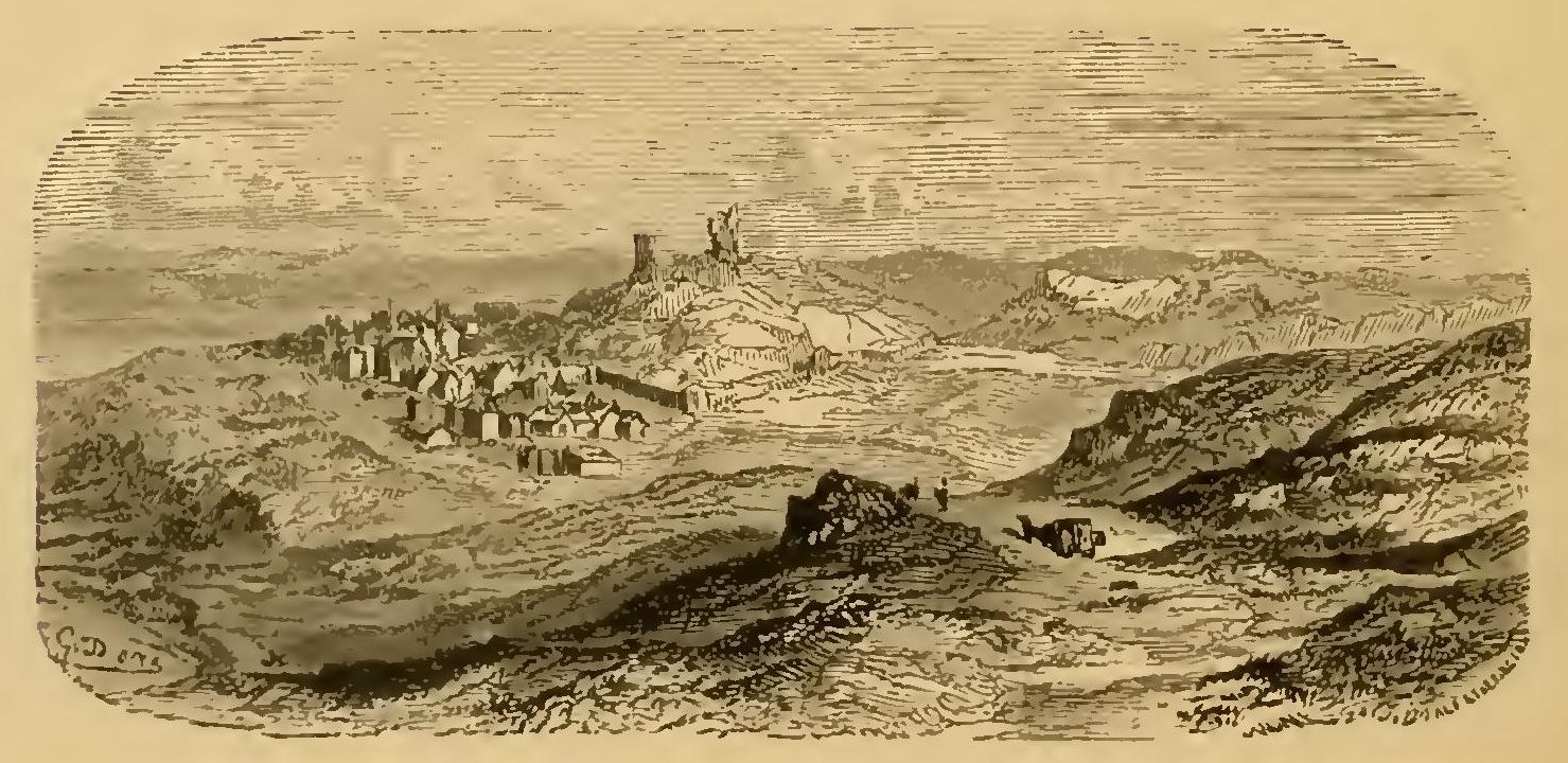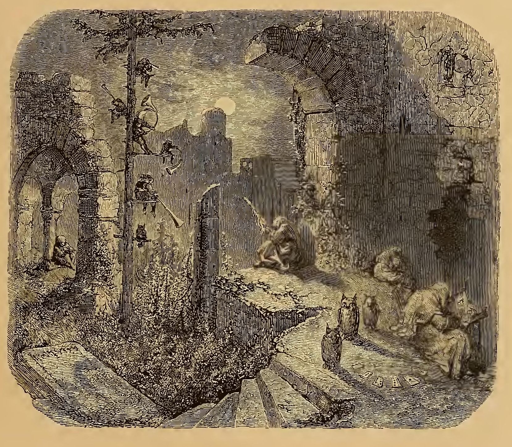Very near here, on a round eminence of bare rock, rises the ruin of a Moorish tower, named Cas-tel-Vieil. Its side is bordered with a frightful mountain, black and brown, perfectly bald and resembling a decayed amphitheatre; the layers hang one over another, notched, dislocated, bleeding; the sharp edges and fractures are yellowed with wretched moss, vegetable ulcers that defile with their leprous patches the nudity of the stone. The pieces of this [498]monstrous skeleton hold together only by their mass; it is crannied with deep fissures, bristling with falling blocks, broken to the very base; it is nothing but a ruin dreary and colossal, sitting at the entrance of a valley, like a battered giant.