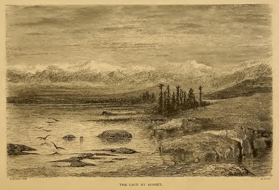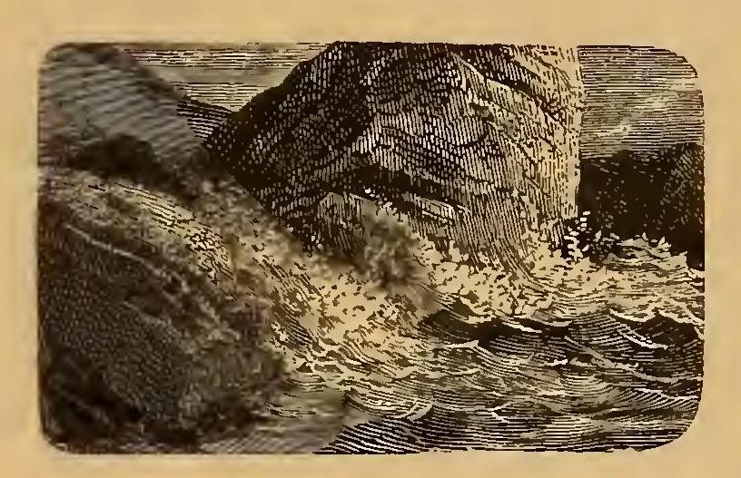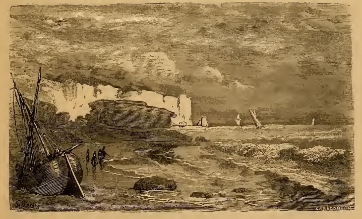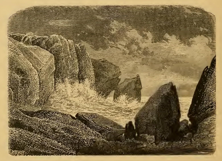 To the left, a train of ploughed and emaciated rocks stretches out in a promontory as far as an [037]arcade of hardened beach, which the high tides have opened, and whence on three sides the eye looks down upon the ocean. Under the whistling north wind it bristles with violet waves; the passing clouds marble it with still more sombre spots; as far as the eye can reach is a sickly agitation of wan waves, chopping and disjointed, a sort of moving skin that trembles, wrenched by an inward fever; occasionally a streak of foam crossing them marks a more violent shock. Here and there, between the intervals of the clouds, the light cuts out a few sea-green fields upon the uniform plain; their tawny lustre, their unhealthy color, add to the strangeness and to the limits of the horizon. These sinister changing lights, these tin-like reflections upon a leaden swell, these white scoriæ clinging to the rocks, this slimy aspect of the waves suggest a gigantic crucible in which the metal bubbles and gleams.