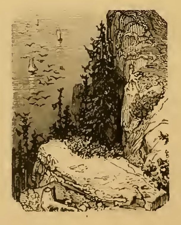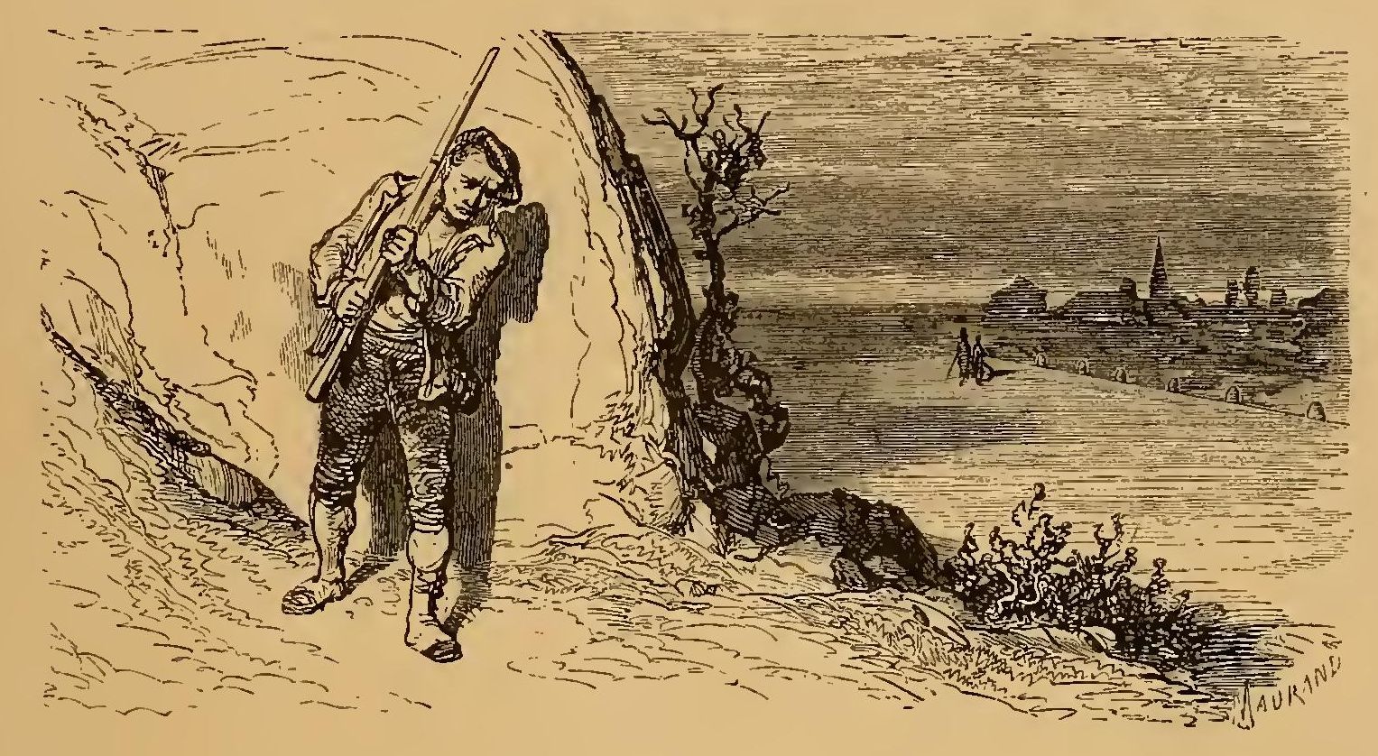 The river is so fine, that before going to Bayonne I have come down as far as Royan. Ships heavy with white sails ascend slowly on both sides of the boat. At each gust of wind they incline like idle birds, lifting their long wing and showing their black belly. They run slantwise, then come back; one would say that they felt the better for being in this great fresh-water harbor; they loiter in it and enjoy its peace after leaving the wrath and inclemency of the ocean. The banks, fringed with pale verdure, glide right and left, far away to the verge of heaven; the river is broad like a sea; at this distance you might think you saw two hedges; the trees dimly lift their delicate shapes in a robe of bluish gauze; here and there great pines raise their umbrellas on the [004]vapory horizon, where all is confused and vanishing; there is an inexpressible sweetness in these first hues of the timid day, softened still by the fog which exhales from the deep river. As for the river itself, its waters stretch out joyous and splendid; the rising sun pours upon its breast a long streamlet of gold; the breeze covers it with scales; its eddies stretch themselves, and tremble like an awaking serpent, and, when the billow heaves them, you seem to see the striped flanks, the taw-ney cuirass of a leviathan.
