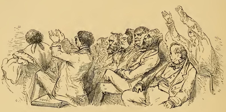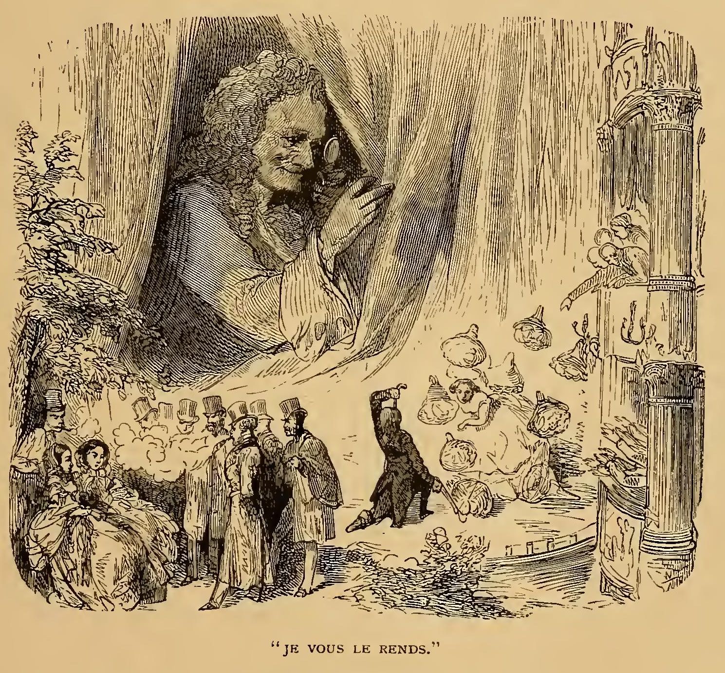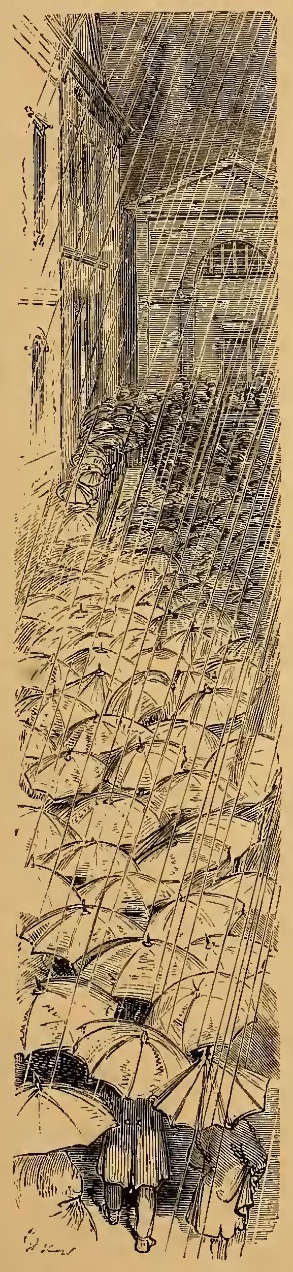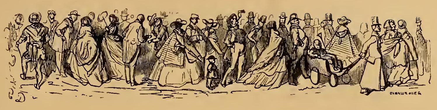 The tradespeople of every sort turn their shops into a lottery: lottery of plate, of books, of little objects of ornament, etc. The tradesman and his wife distribute cards, price one sou, to the servant-maids, soldiers, and children, who compose the crowd. Somebody draws; the gallery and those interested stretch their necks eagerly forward. The man reads the number; a cry is heard, the unguarded sign of an overflowing joy. “It’s I that have won, I, monsieur the merchant.” And you see a little serving-maid, blushing all over, lift herself on tiptoe and stretch out her hands. The merchant dexterously seizes a pot, parades it above his head, and makes everybody about remark it. “A fine mustard-pot; a mustard-pot worth three francs, threaded with gold. Who wants numbers?” The assembly lasts four hours. It begins anew every day; the customers are not wanting for a single moment.