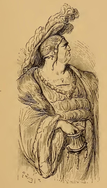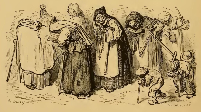 There was an old beggar-woman there, with naked feet and arms, who was worthy of the mountain. For a dress she had a bundle of rags of every color sewn together, and remained the whole day long crouched in the dust. One might have counted the muscles and tendons of her limbs; the sun had dried her flesh and burned her skin; she resembled the rock against which she was sitting; she was tall, with large, regular features, a brow seamed with wrinkles like the bark of an oak, beneath her grizzled lids a savage black eye, a mat of white hair hanging in the dust. If a sculptor had wished to make a statue of Dryness, the model was there.