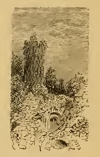 The waters consume the coast; great pieces of earth and stone, hardened by their shock, fifty feet away from the shore, lift their brown and yellow spine, worn, raked, gnawed, jagged, scooped out [036]by the wave, resembling a troop of stranded whales. The billow barks or bellows in their hollow bowels, in their deep yawning jaws; then, after they have engulfed it, they vomit it forth in jets and foam against the lofty shining waves that forever return to the assault. Shells and polished pebbles are incrusted upon their head. Here furzes have rooted their patient stems and the confusion of their thorns; this hairy mantle is the only one capable of clinging to their flanks, and of standing out against the spray of the sea.