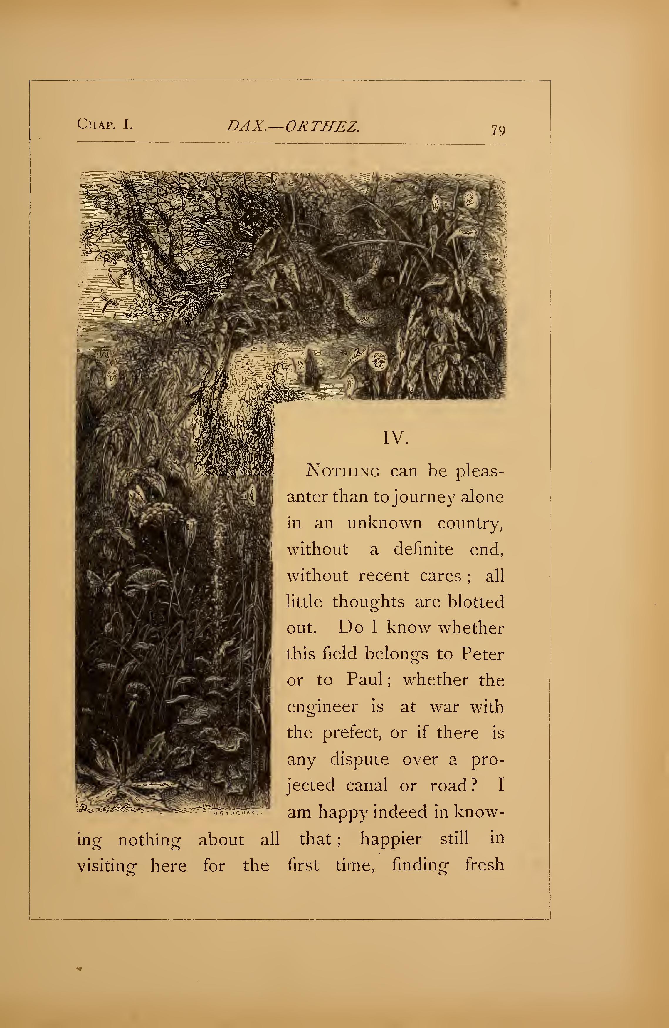 BOOK I.—THE COAST. CHAPTER I.—BORDEAUX.—ROY AN...................003 “ II.—LES LANDES.—BAYONNE..............012 “ III.—BIARRITZ.—SAINT-JEAN-DE-LUZ.....035 BOOK II.—THE VALLEY OF OSSAU. CHAPTER I. —DAX.—OR THEZ.....................057 “ II.—PAU.............................085 “ III.—EAUX-BONNES...................117 “ IV.—LANDSCAPES.....................138 “ V.—EAUX-CHAUDES...................169 “ VI.—THE INHABITANTS.................186 BOOK III.—THE VALLEY OF LUZ. CHAPTER I.—ON THE WAY TO LUZ.................225 “ II.—LUZ..............................250 “ III.—SAINT-SAUVEUR.—BAREGES.........266 “ IV.—CAUTERE..........................290 “ V.—SAINT-SATIN.......................315 “ VI.—GAVARNIE.........................326 “ VII.—THE BERGONZ.—THE PIC DU MIDI...352 “ VIII.—PLANTS AND ANIMALS.............367 BOOK. IV.—BAGNÈRES AND LUCHON. CHAPTER I.—FROM LUZ TO BAGNÈRES-DE-BIGORRE...389 “ II.—BAGNÈRES-DE-BIGORRE..............412 “ III.—THE PEOPLE......................420 “ IV—THE ROAD TO BAGNÈRES-DE-LUCHON....468 “ V—LUCHON.............................485 “ VI.—TOULOUSE.........................509