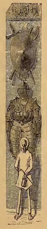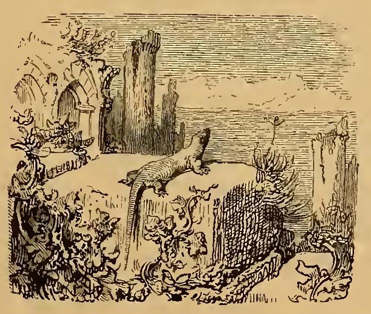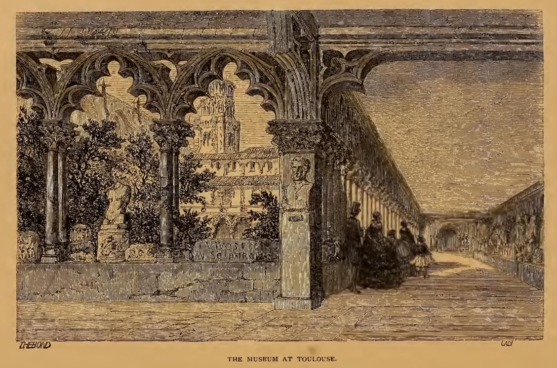 Below the museum is a square tower enclosed by a gallery of slender columns, which towards the top bend and are cut into trefoils, forming a border of arcades. They have gathered under this gallery all the antiquities of the country: fragments of Roman statues, severe busts of emperors, ascetic virgins of the middle ages, bas-reliefs from churches and temples, knights of stone lying all armed upon their tombs. The court was deserted and silent; tall slender trees, tufted shrubbery, were bright with the loveliest green. A dazzling sunlight fell on the red tiles of the gallery; an old fountain, loaded with little columns and heads of animals, murmured near to a bench of rose-veined marble. A statue of a young man was seen amidst the branches; stems of green hops climbed up around broken columns.[521]
