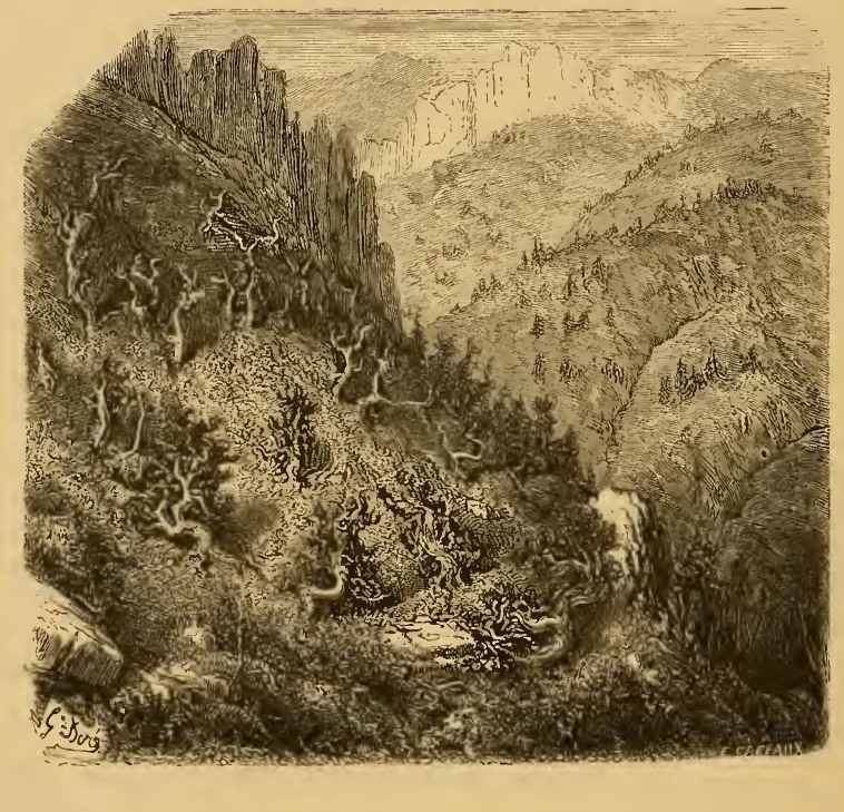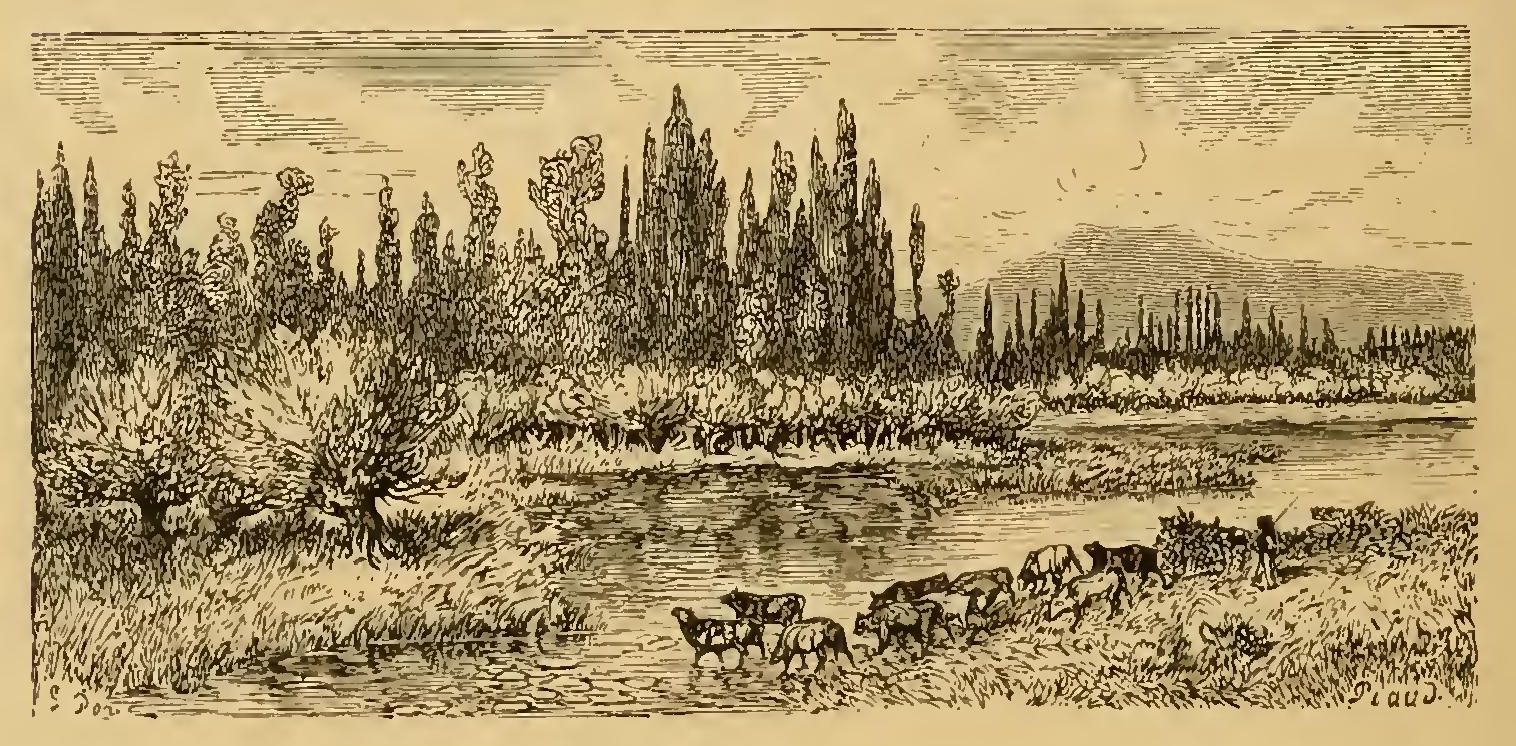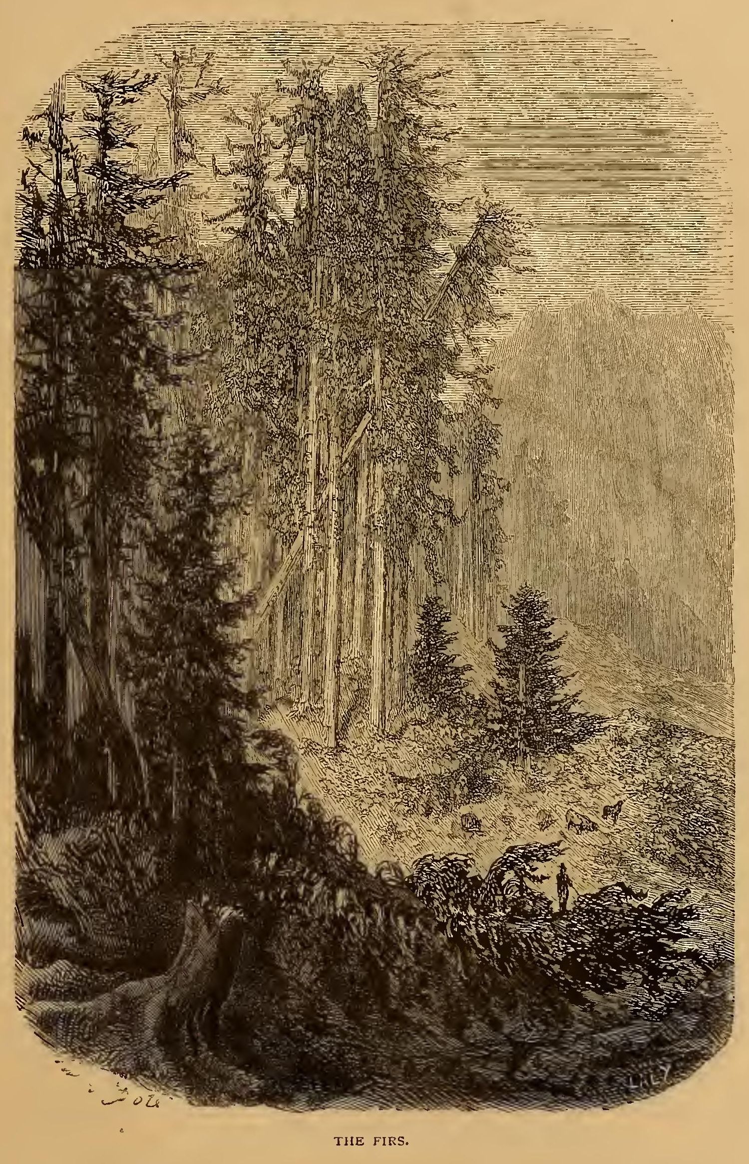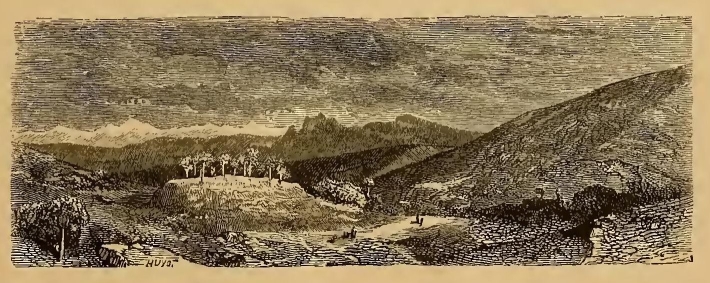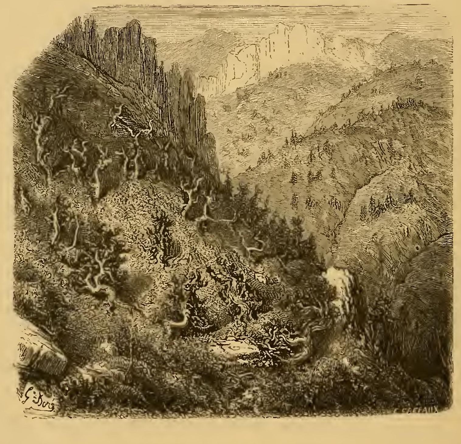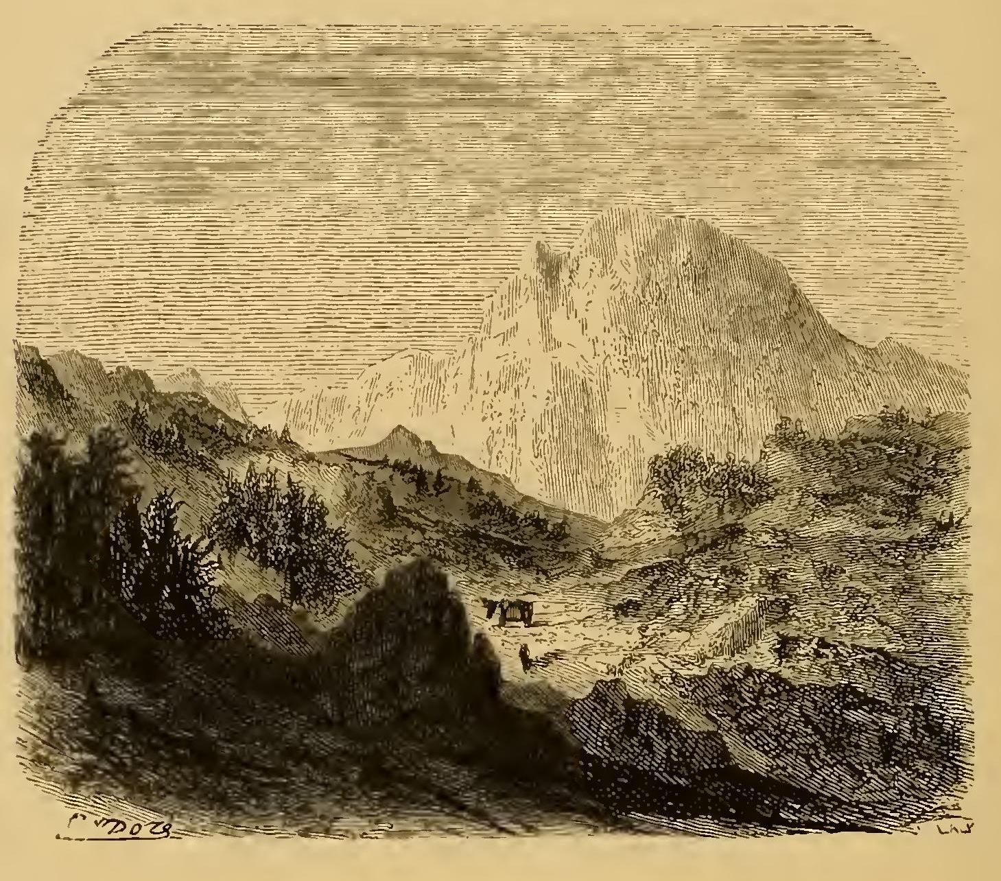 A winding staircase, crossed by springs, then steep pathways in a black forest of firs lead you in two hours to the pastures on the summit. The mountain is about five thousand feet high. These pastures are great undulating hills, ranged in rows, carpeted with short turf and thickset, fragrant thyme; here and there in crowds are broad tufts [493]of a sort of wild iris, the flower of which fades in the month of August.