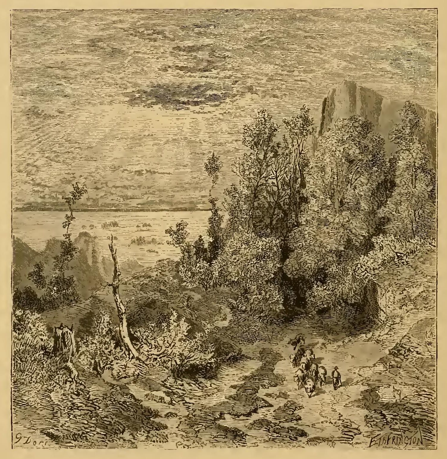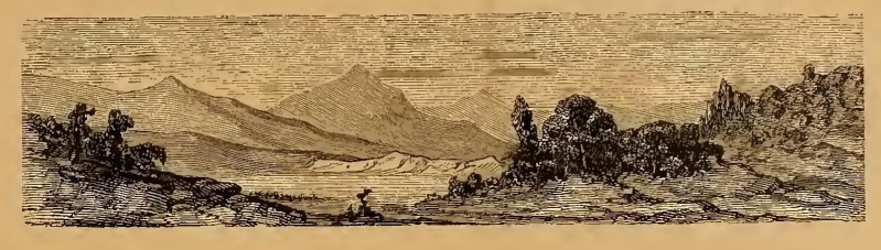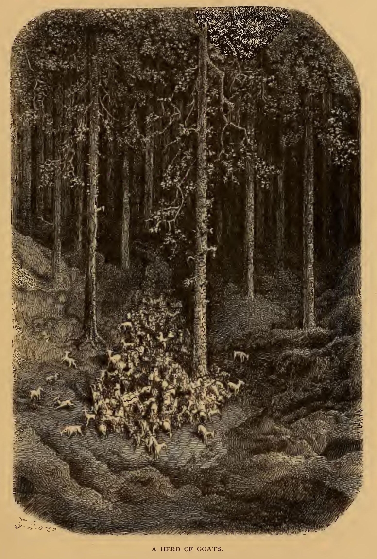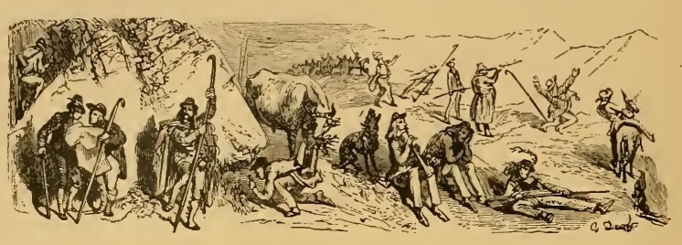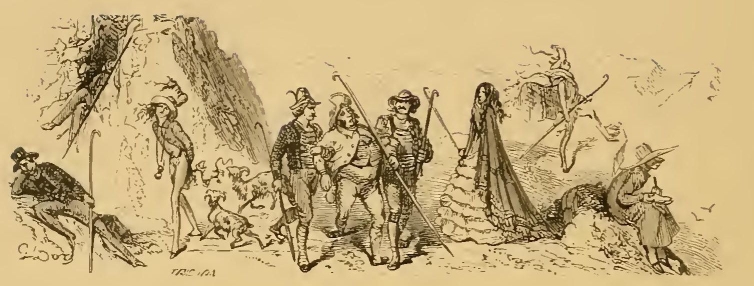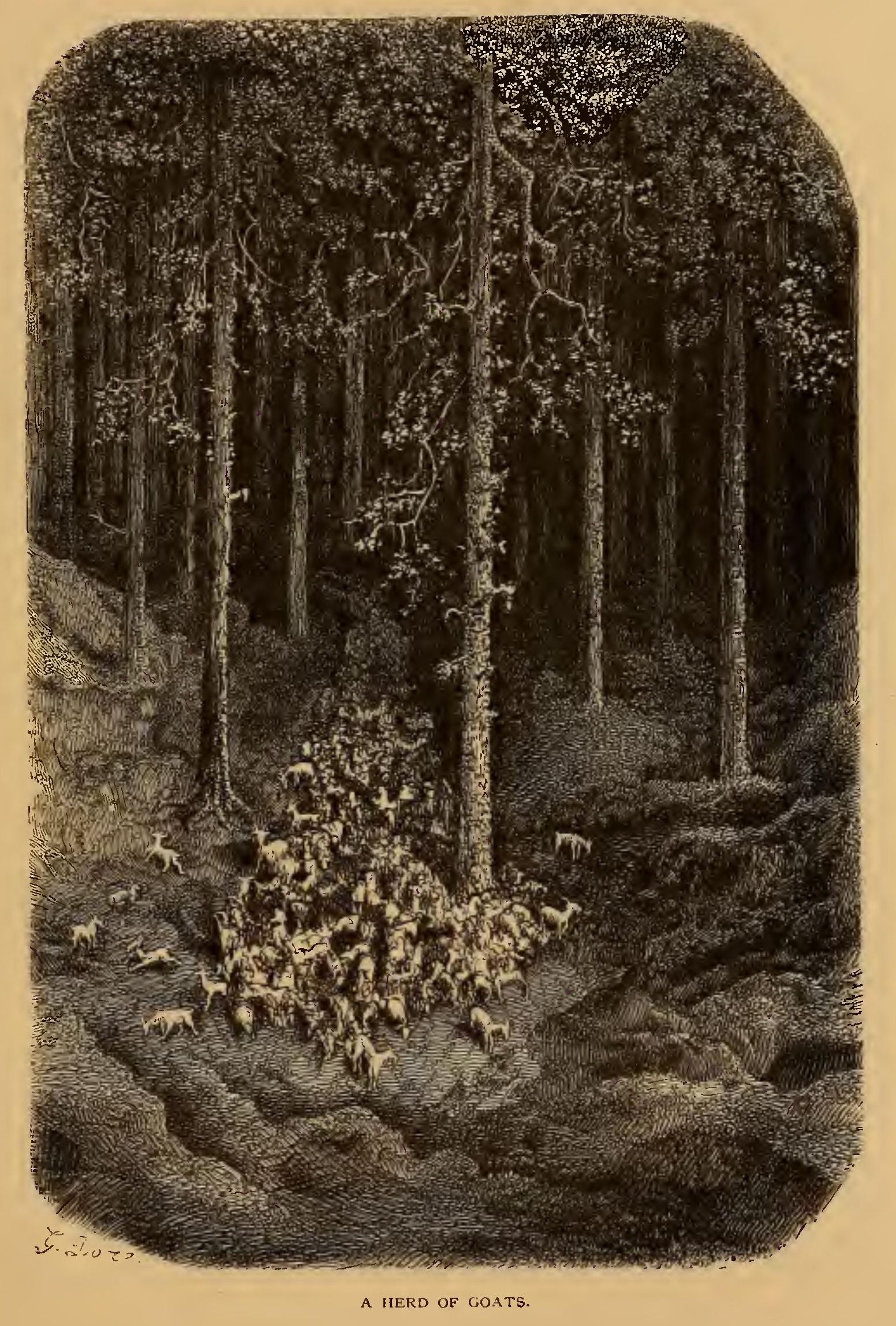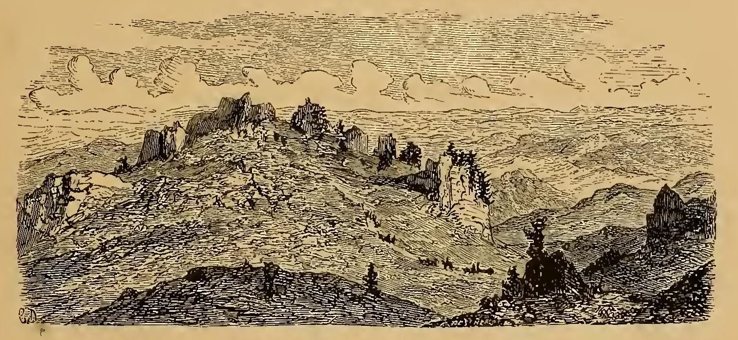 A winding staircase, crossed by springs, then steep pathways in a black forest of firs lead you in two hours to the pastures on the summit. The mountain is about five thousand feet high. These pastures are great undulating hills, ranged in rows, carpeted with short turf and thickset, fragrant thyme; here and there in crowds are broad tufts [493]of a sort of wild iris, the flower of which fades in the month of August.