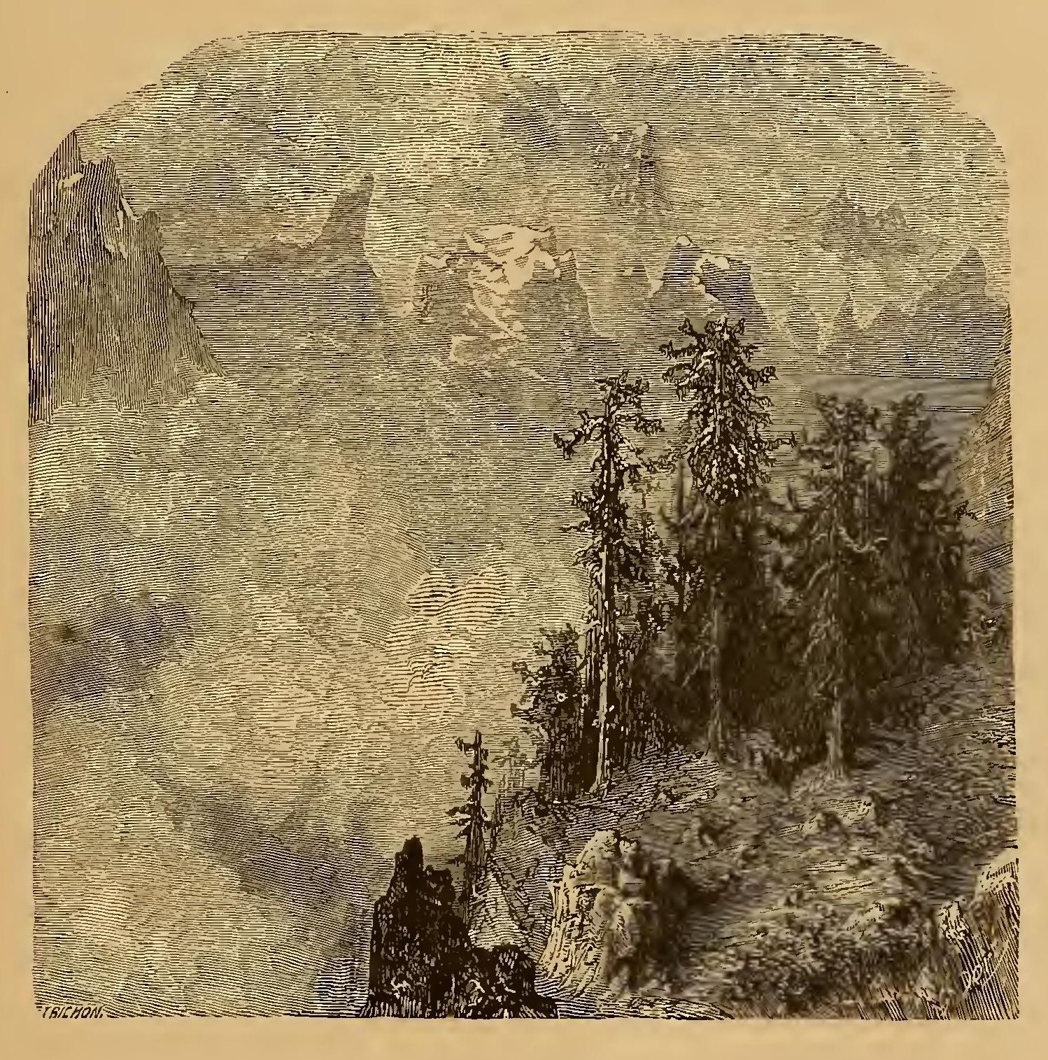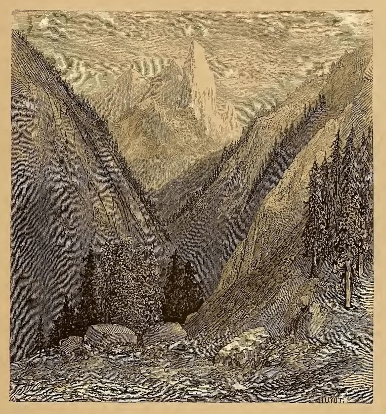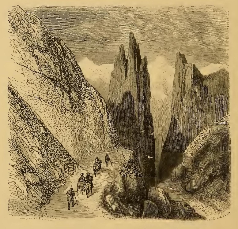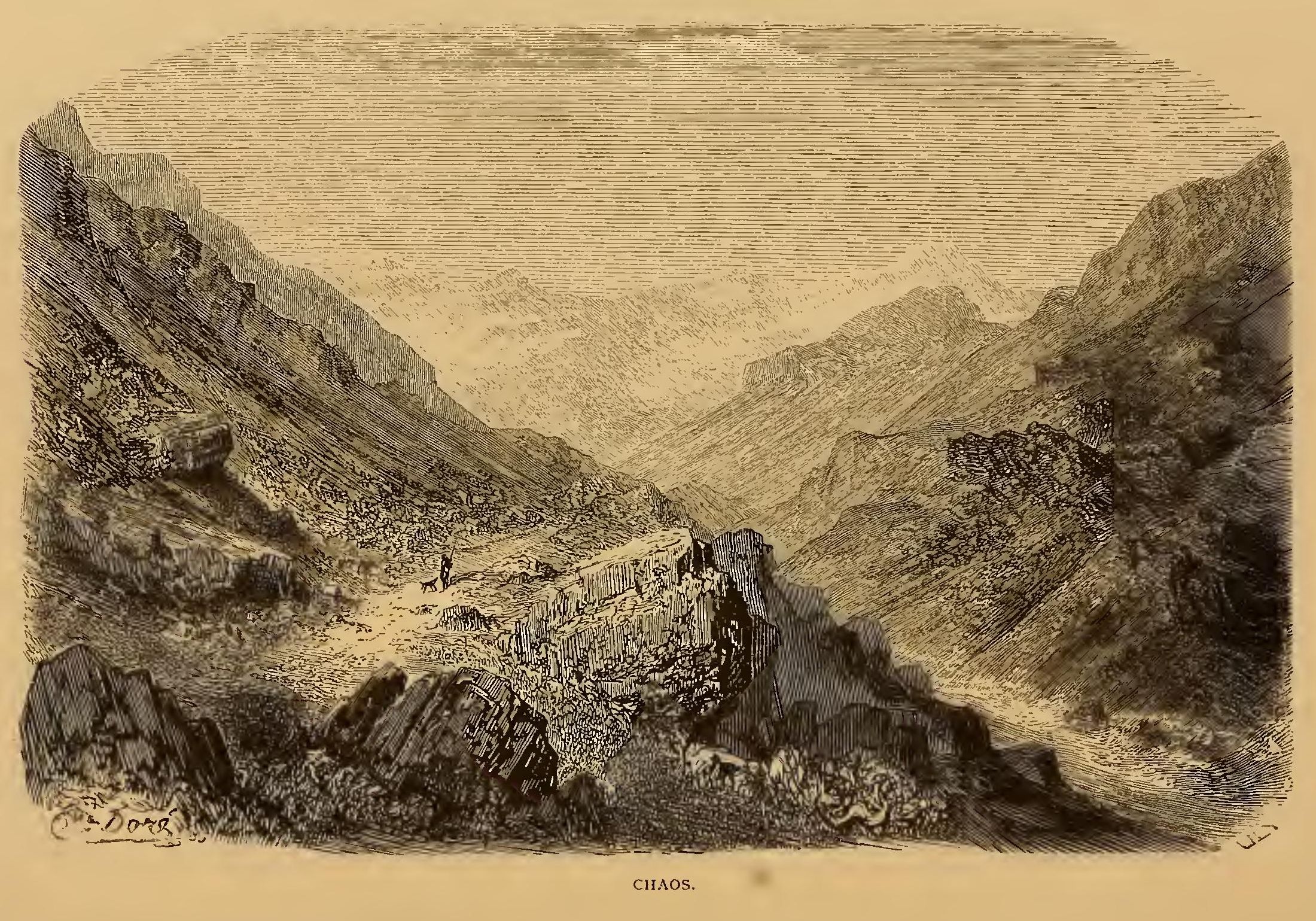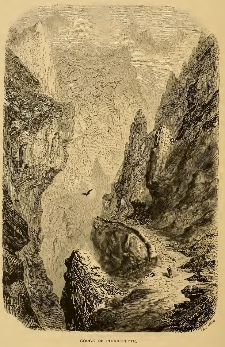 At the bottom of a hollow filled with plants, appears the hospice of Bagnères, a heavy house of stone, which serves as a refuge. The mountains open opposite it their amphitheatre of rock, a huge [502]and blasted pit; to crown the whole the clouds have gathered, and dull the rent enclosure which fences off the horizon—enclosure that winds with dreary air, perfectly barren, with the grinning army of its pinnacles, its raw cuts, its murderous steeps; beneath the dome of clouds, wheels a band of screaming crows. This well seems their eyry; wings are needed to escape the hostility of all those bristling points, and of so many yawning gulfs which draw on the passer in order to dash him to atoms.