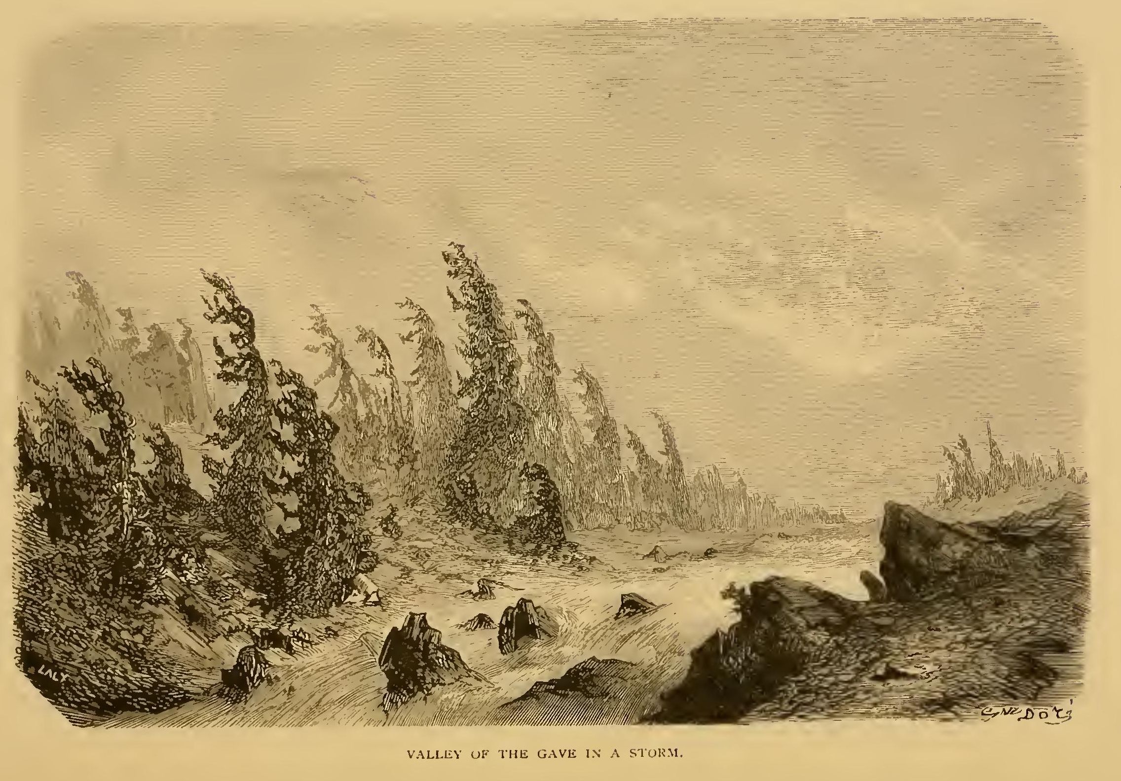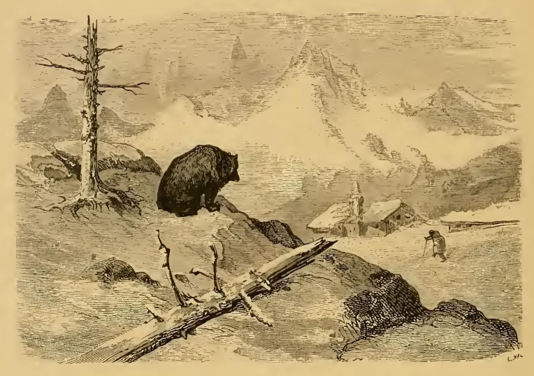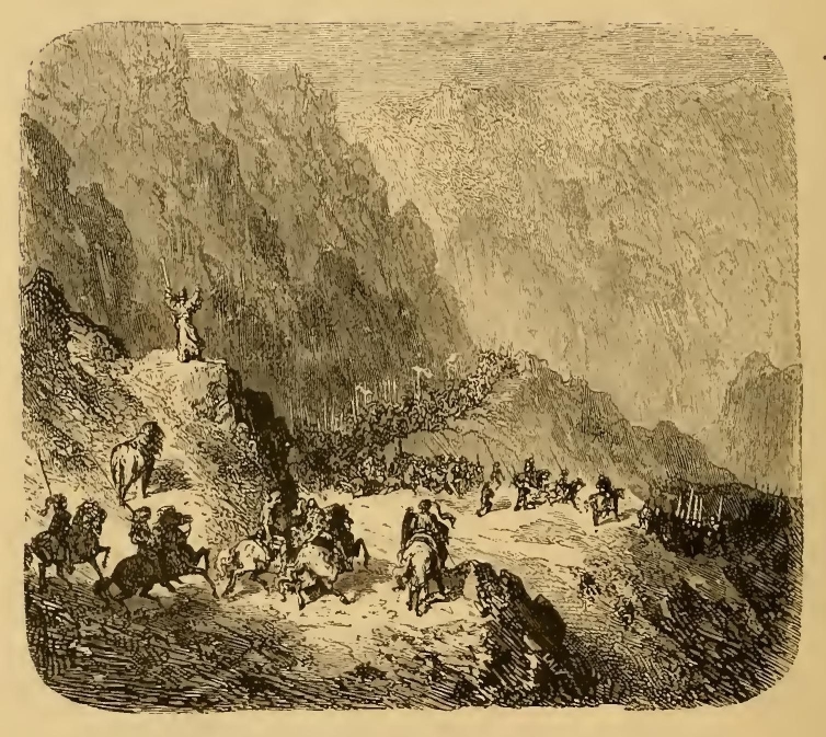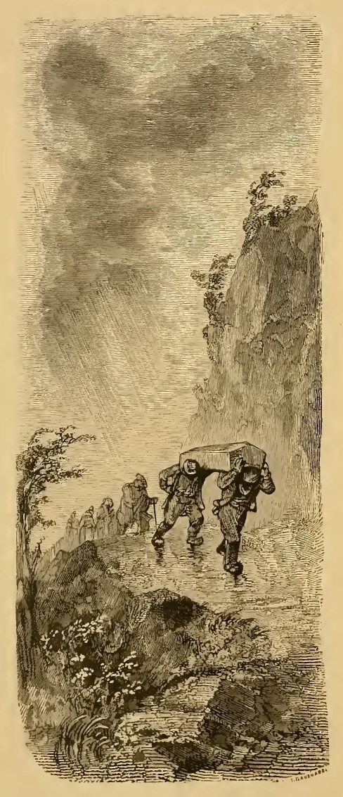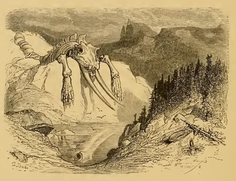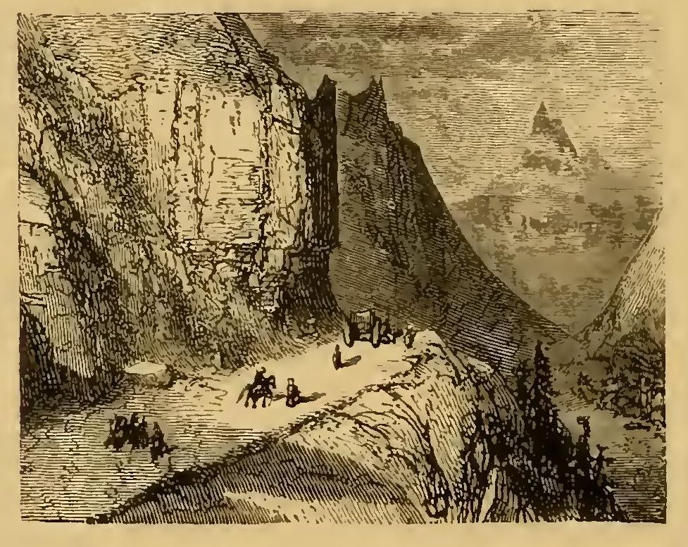 At the bottom of a hollow filled with plants, appears the hospice of Bagnères, a heavy house of stone, which serves as a refuge. The mountains open opposite it their amphitheatre of rock, a huge [502]and blasted pit; to crown the whole the clouds have gathered, and dull the rent enclosure which fences off the horizon—enclosure that winds with dreary air, perfectly barren, with the grinning army of its pinnacles, its raw cuts, its murderous steeps; beneath the dome of clouds, wheels a band of screaming crows. This well seems their eyry; wings are needed to escape the hostility of all those bristling points, and of so many yawning gulfs which draw on the passer in order to dash him to atoms.