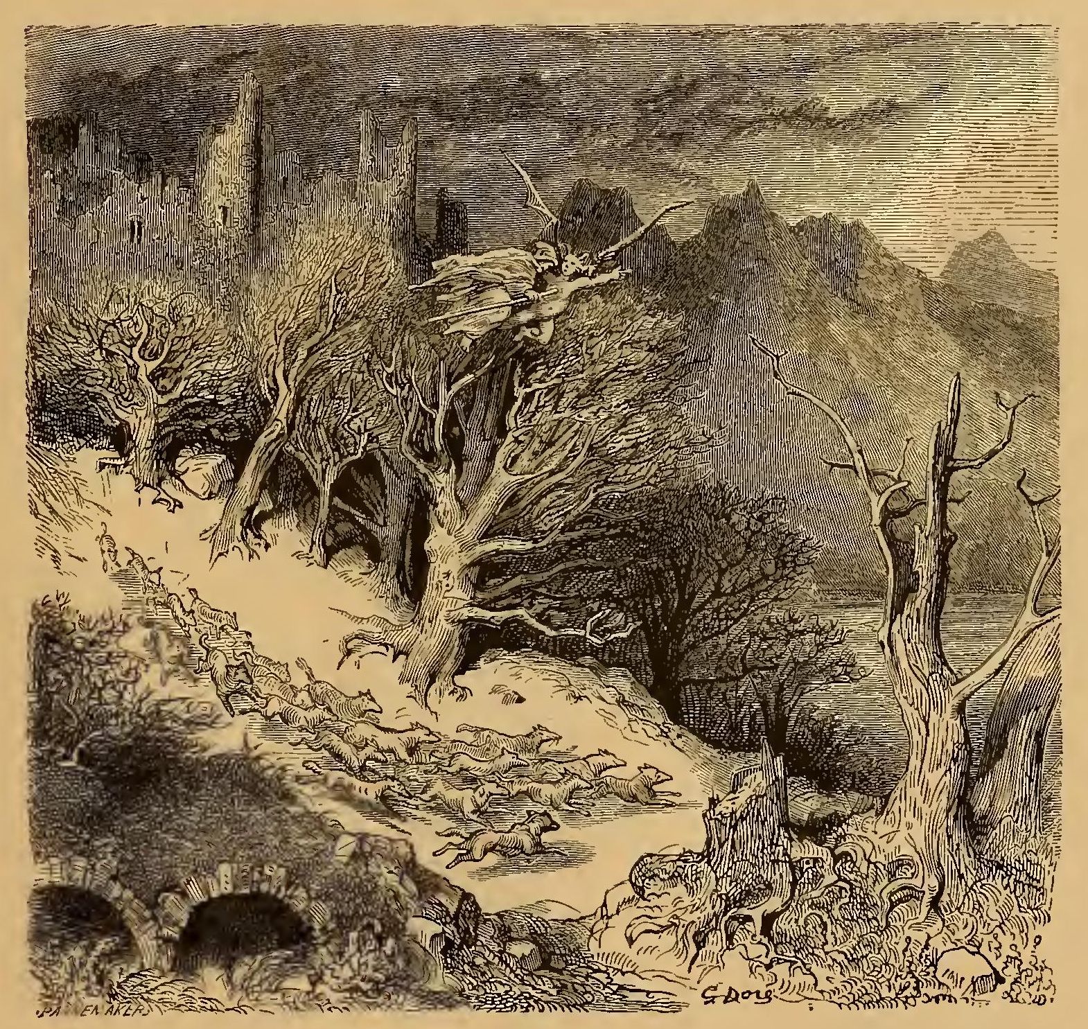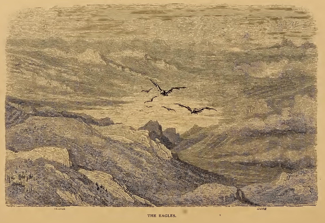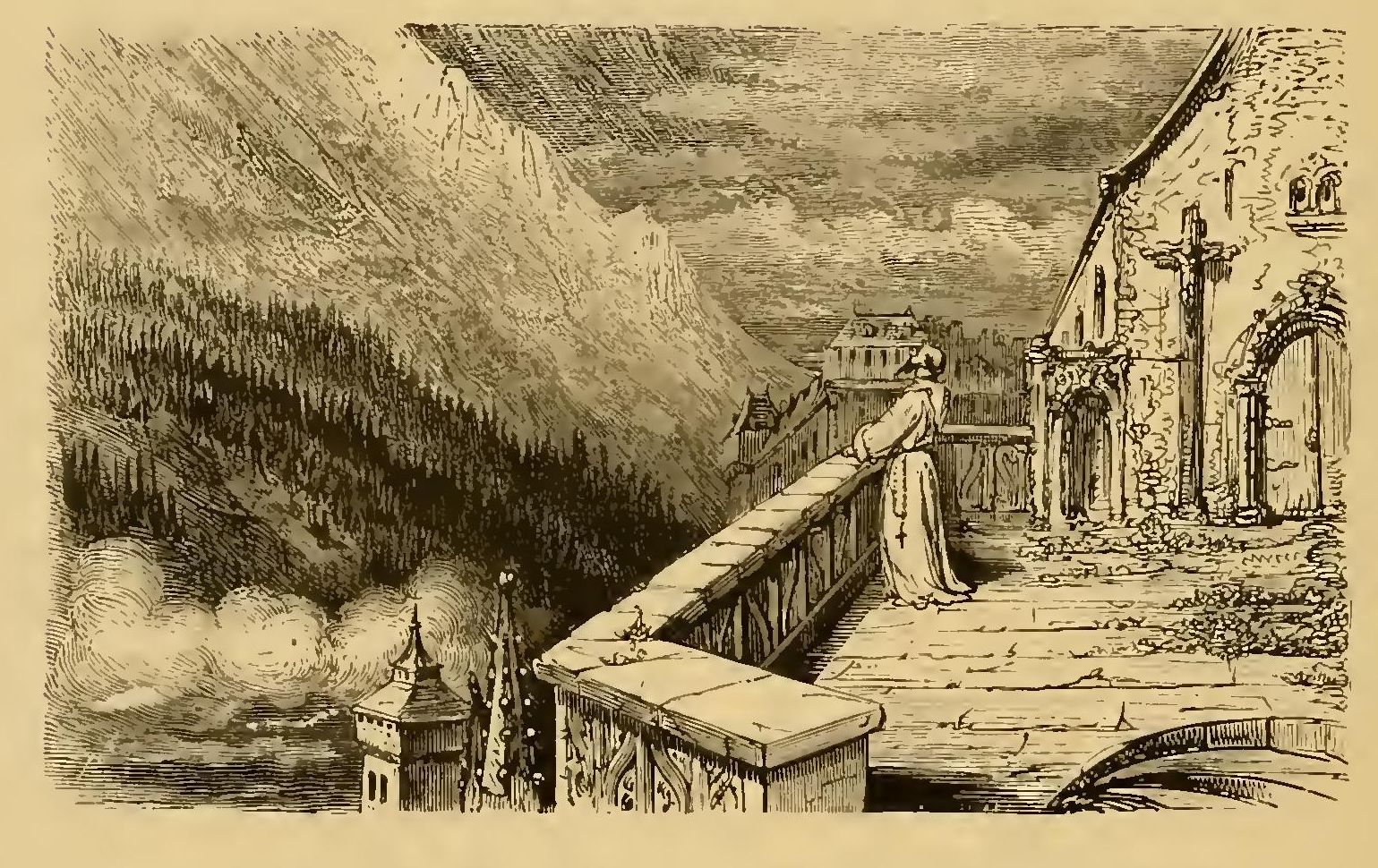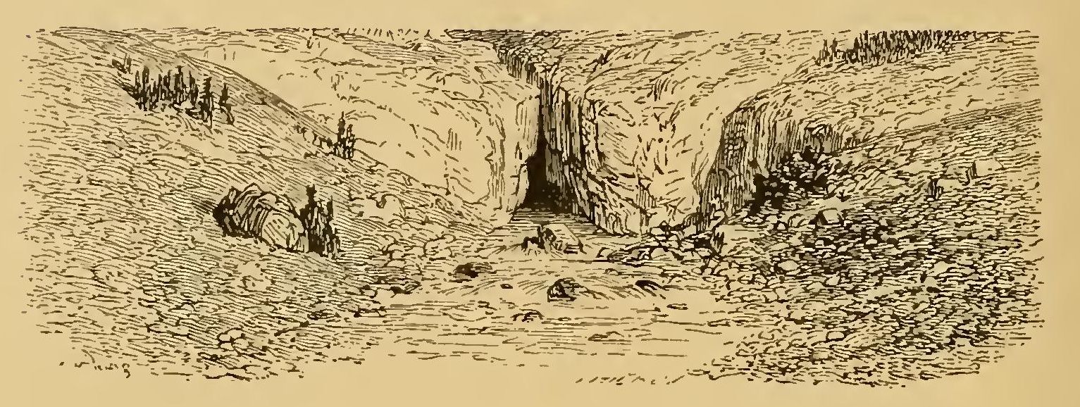 At the bottom of a hollow filled with plants, appears the hospice of Bagnères, a heavy house of stone, which serves as a refuge. The mountains open opposite it their amphitheatre of rock, a huge [502]and blasted pit; to crown the whole the clouds have gathered, and dull the rent enclosure which fences off the horizon—enclosure that winds with dreary air, perfectly barren, with the grinning army of its pinnacles, its raw cuts, its murderous steeps; beneath the dome of clouds, wheels a band of screaming crows. This well seems their eyry; wings are needed to escape the hostility of all those bristling points, and of so many yawning gulfs which draw on the passer in order to dash him to atoms.