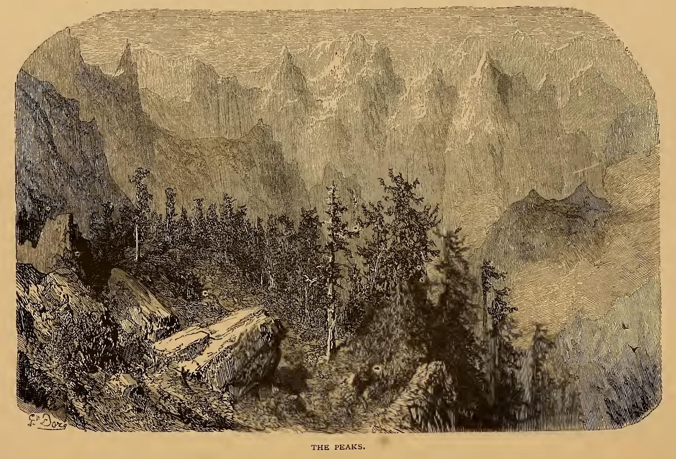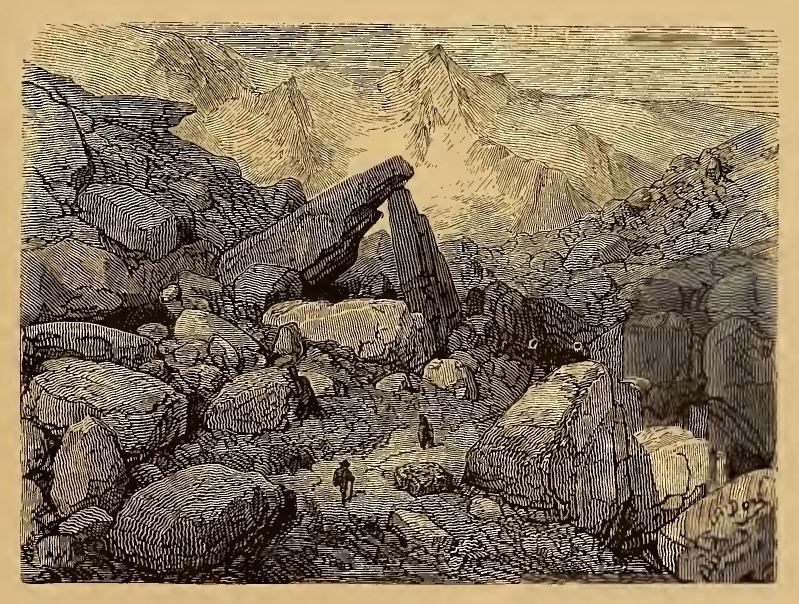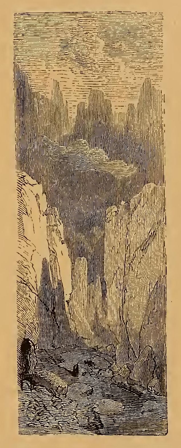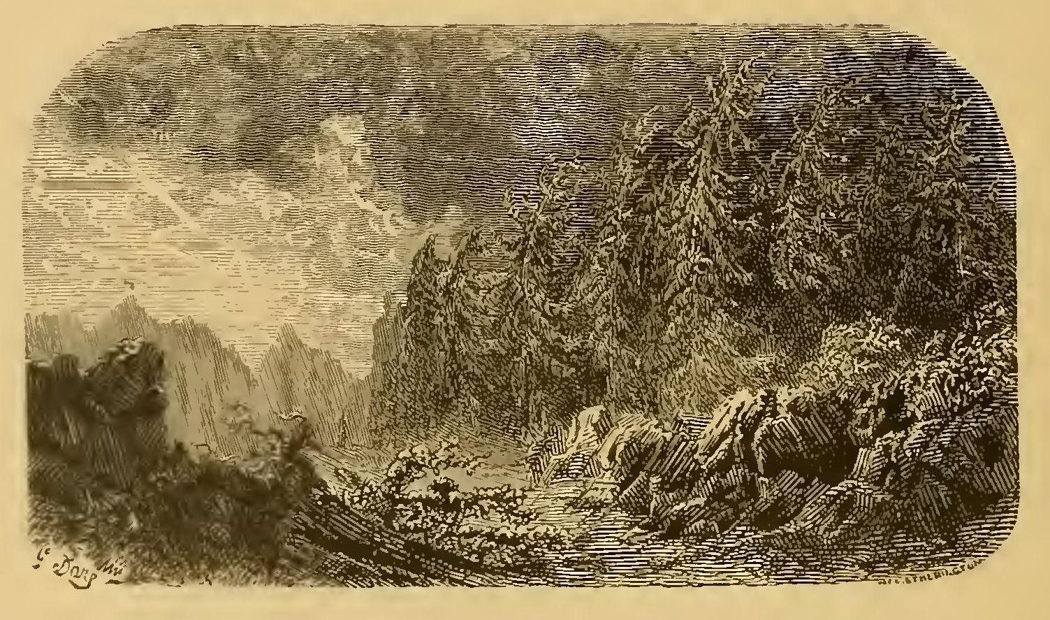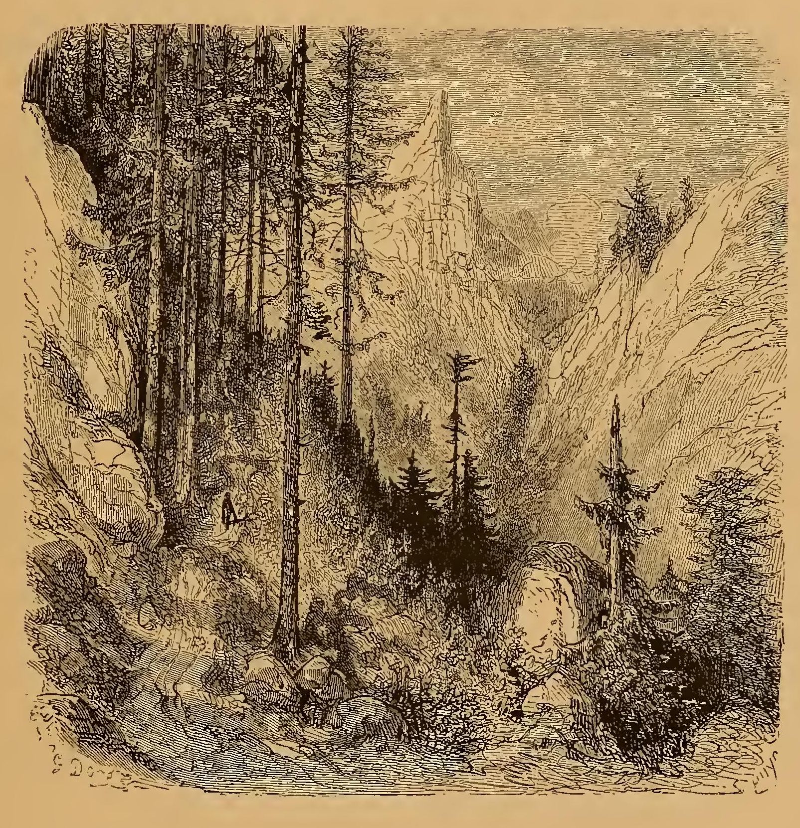 Soon the road seems brought to an end; wall after wall, the serried rocks obstruct every outlet; still you advance, zigzag, among rounded blocks, along a falling stairway; the wind sweeps down these, howling. No sign of life, no herbage; everywhere the horrible nakedness and the chill of winter. Squat rocks lean beetling over the precipice; others project their heads to meet one another; between them the eye plunges into dark gulfs whose bottom it cannot reach. The violent juttings of all parts advance and rise, piercing the air; down there, at the bottom, they spring forward in lines, climbing over one another, in heaps, bristling against the sky their hedge of pikes. Suddenly in this terrible battalion a cleft is opened; the Maladetta springs up like a great spectre; forests of shivered pines wind about its foot; a girdle of black rocks embosses its arid breast, and the glaciers make it a crown.[503]
