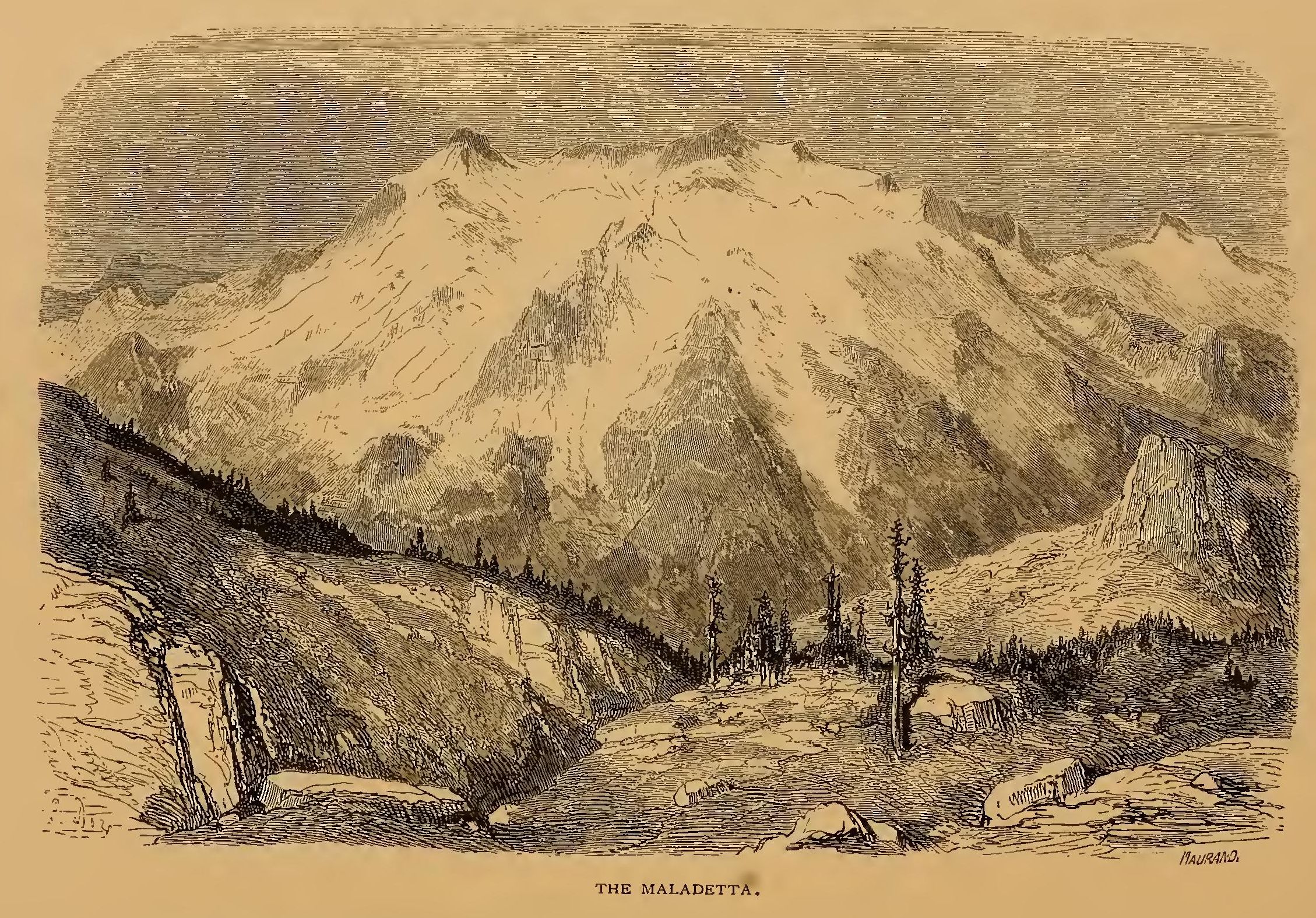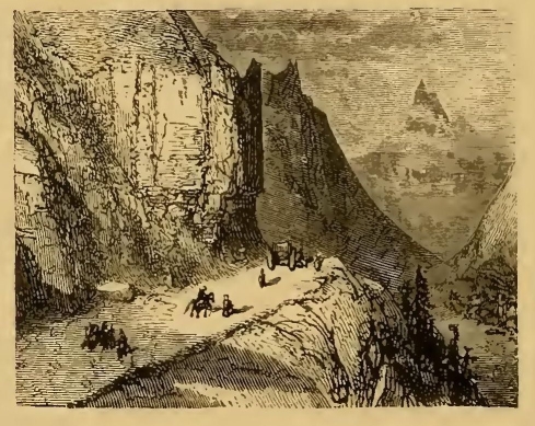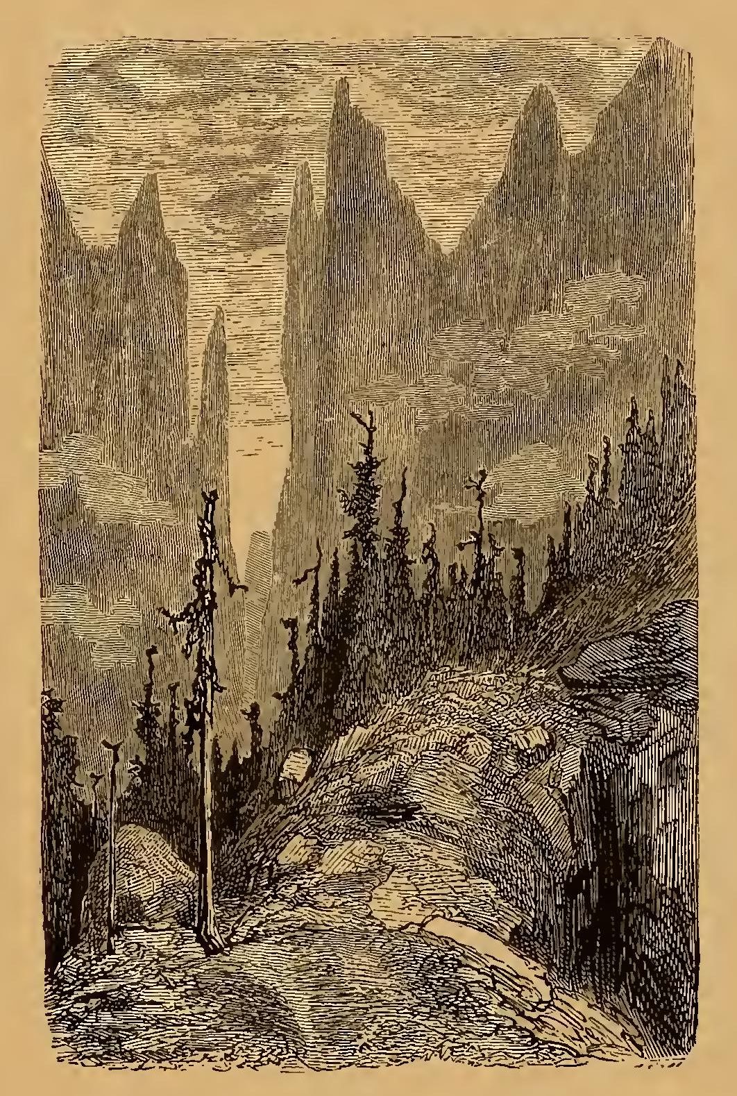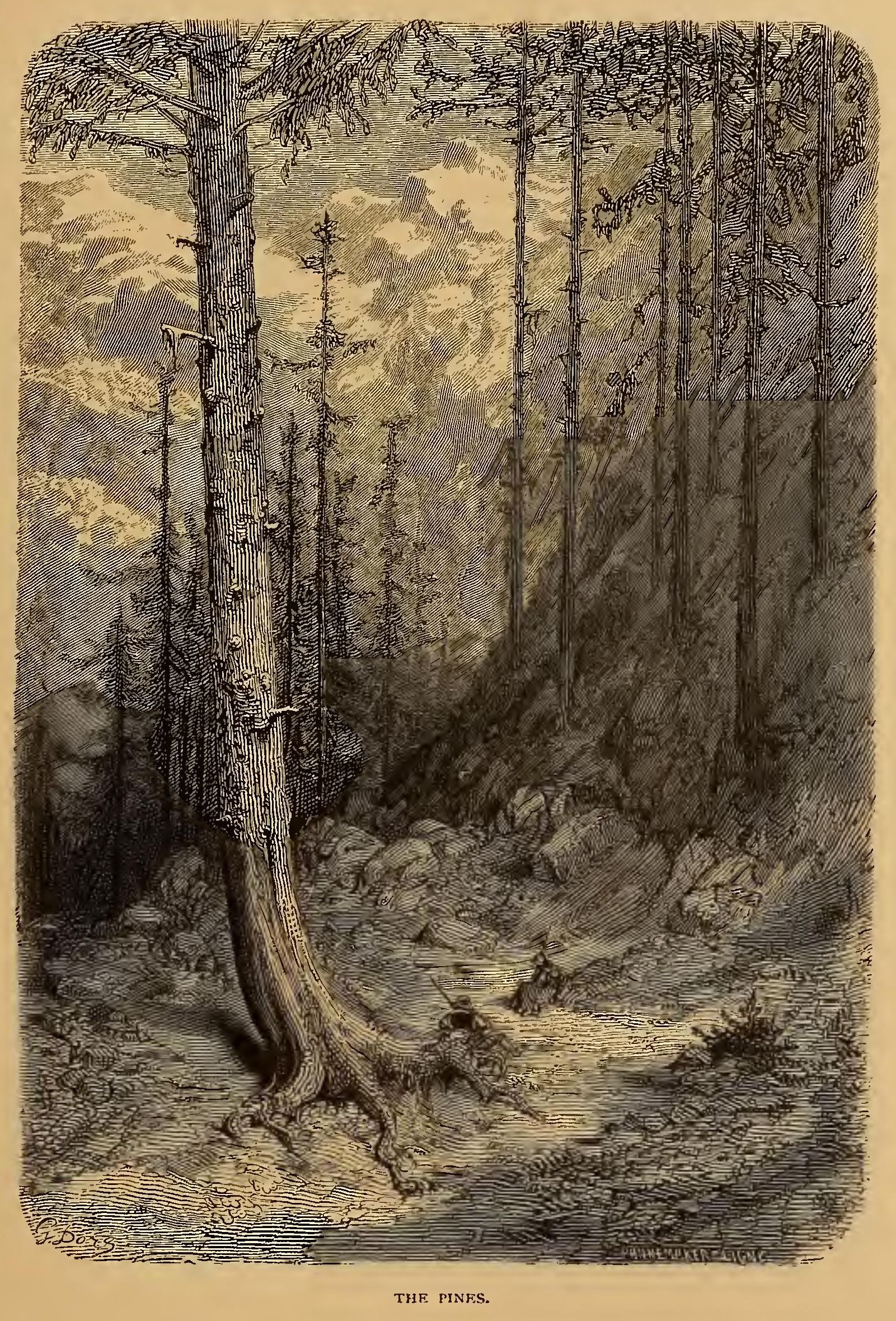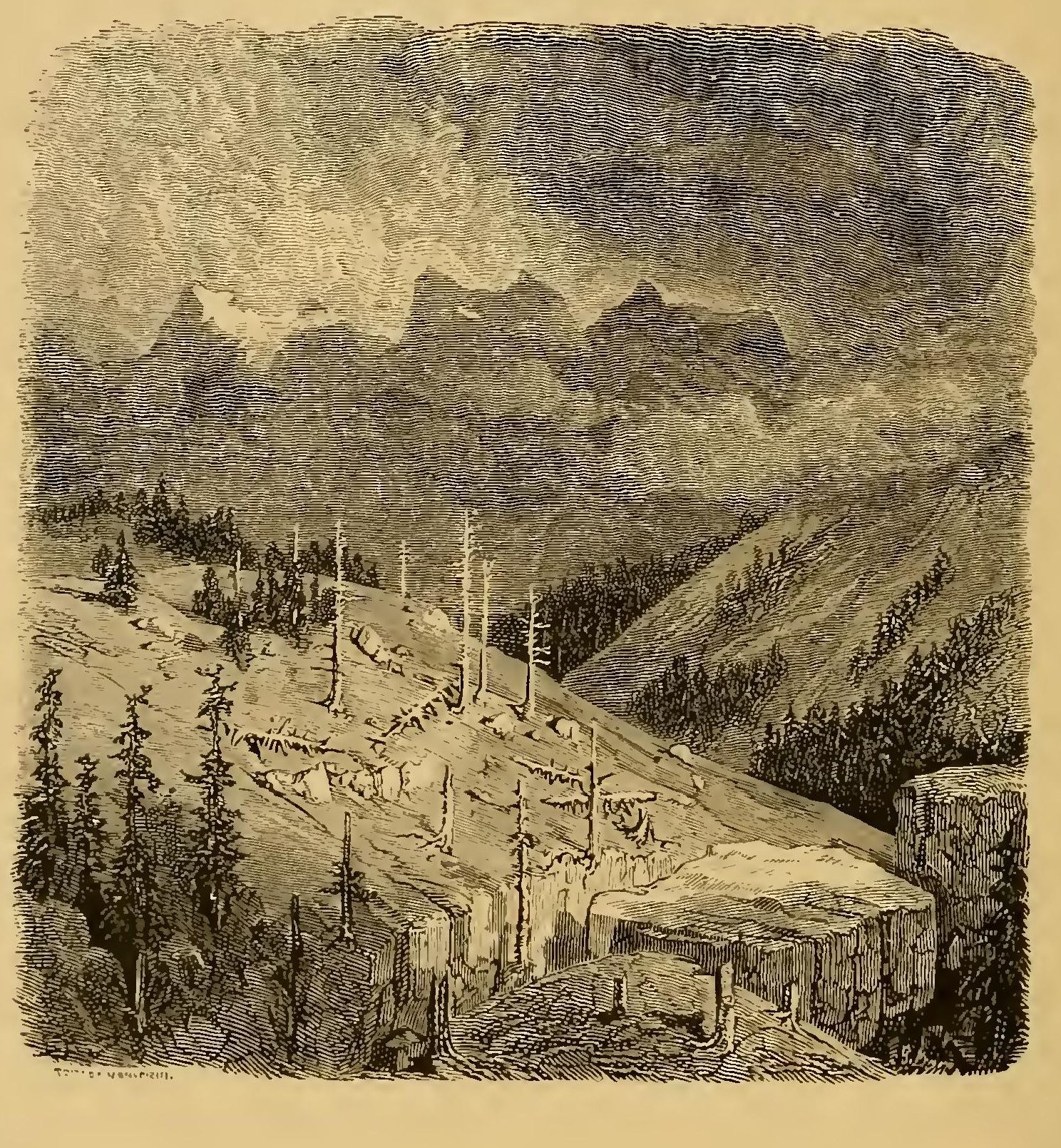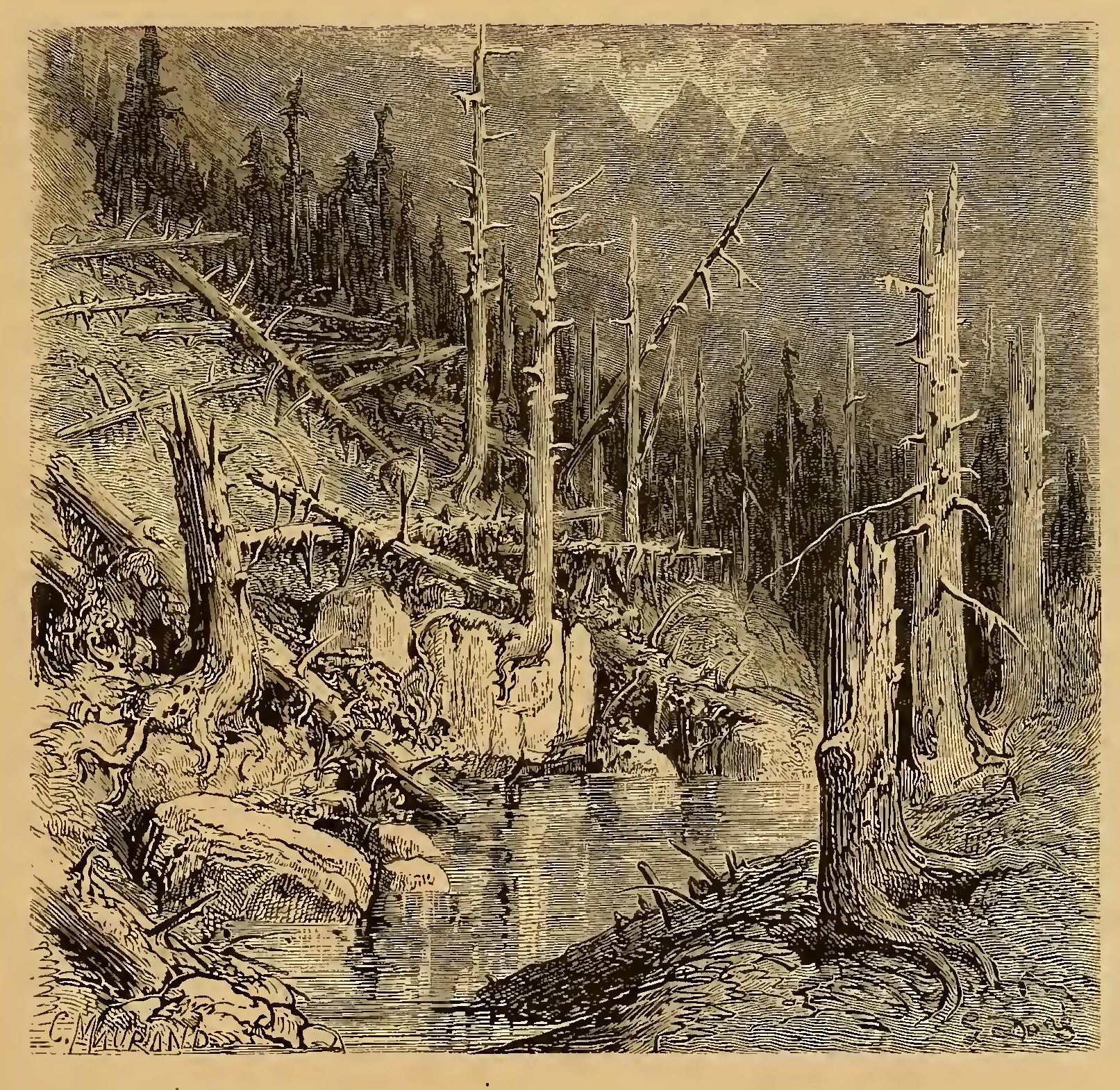 Soon the road seems brought to an end; wall after wall, the serried rocks obstruct every outlet; still you advance, zigzag, among rounded blocks, along a falling stairway; the wind sweeps down these, howling. No sign of life, no herbage; everywhere the horrible nakedness and the chill of winter. Squat rocks lean beetling over the precipice; others project their heads to meet one another; between them the eye plunges into dark gulfs whose bottom it cannot reach. The violent juttings of all parts advance and rise, piercing the air; down there, at the bottom, they spring forward in lines, climbing over one another, in heaps, bristling against the sky their hedge of pikes. Suddenly in this terrible battalion a cleft is opened; the Maladetta springs up like a great spectre; forests of shivered pines wind about its foot; a girdle of black rocks embosses its arid breast, and the glaciers make it a crown.[503]