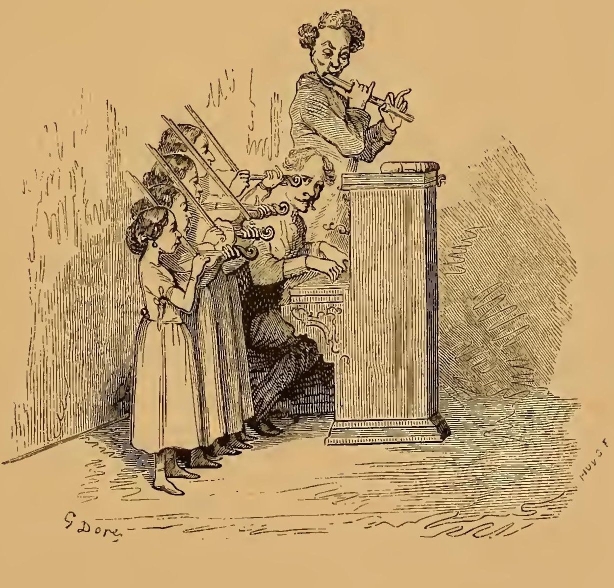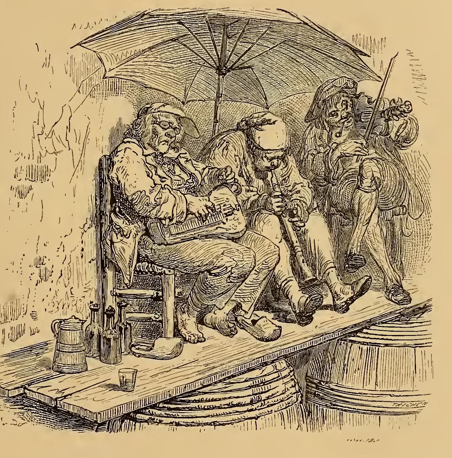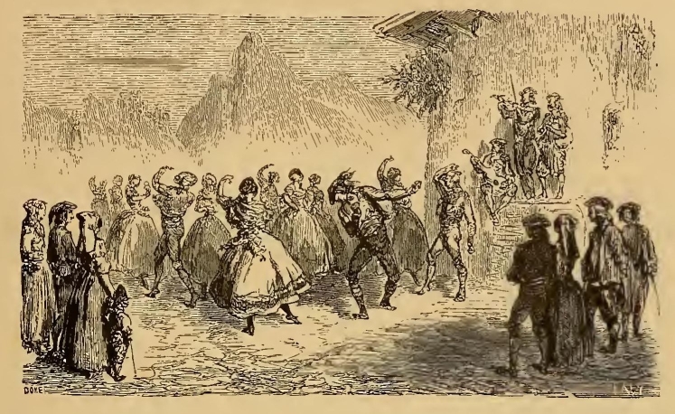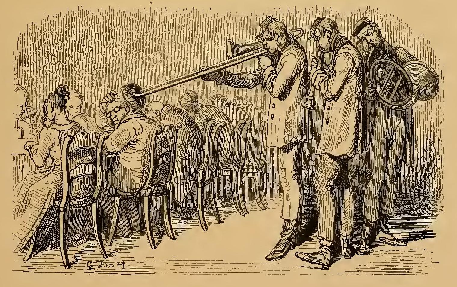 There are several balls, and orchestras in certain cafés. These orchestras are strolling families, hired at so much a week, to make the house uninhabitable. One of these, composed of a flute, male, and four violins, female, used fearlessly to play the same overture every evening. The privileged beings [488]who had paid were in the hall among the music stands. A throng of peasants always crowded at the door, with open mouths; they formed in a circle and mounted on the benches to see.