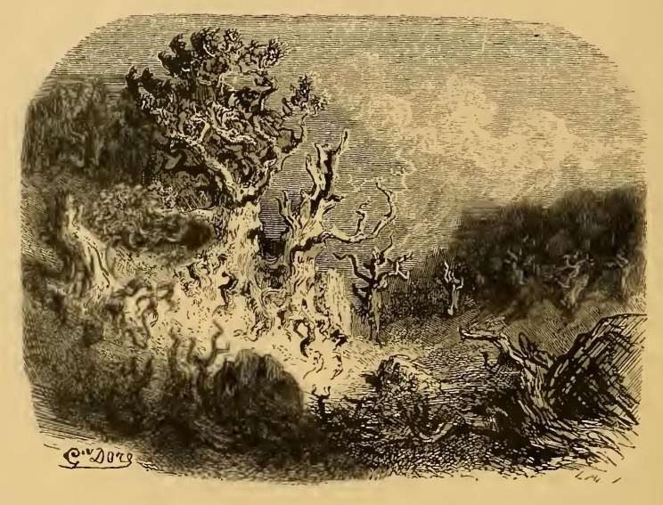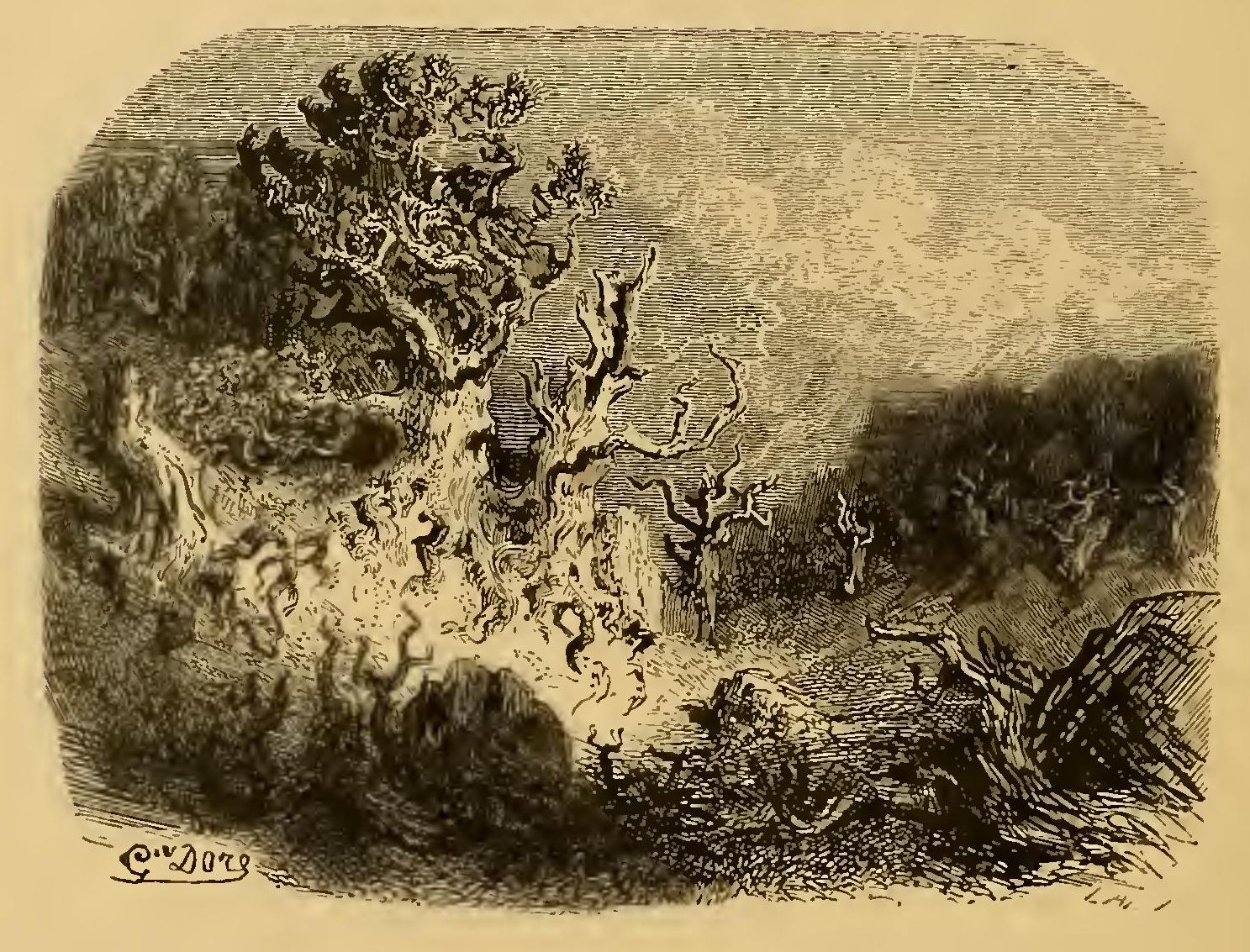 [015]Each tree bears on its side the scar of wounds where the woodmen have set flowing the resinous blood which chokes it; the powerful liquor still ascends into its limbs with the sap, exhales by its slimy shoots and by its cleft skin; a sharp aromatic odor fills the air.