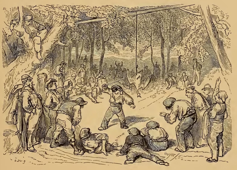 There died Jean Amacho in a sad enough fashion, and from no fault of his own; for after he had cut the throat of a Bayonnais,—his ordinary mode of killing, and, indeed, the best of all,—he held his head too near, and the jet from the two great veins of the neck spirted into his face like the froth from a jar of perry as it is uncorked, and suddenly shut up both his eyes; accordingly he was unable to avoid a Bayonnais who was at his left; the fellow planted his dagger in Jean’s back, who spit out blood, and died a minute after.