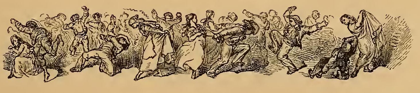 But the younger of the Basques, although there was nothing more to kill, rolled their eyes all around the hall, grinding their teeth like hounds after the quarry; they cried aloud continually, trembling in their limbs and clenching their fingers after the handles of their daggers; several, wounded and whitelipped, no longer felt their wounds or their loss of blood, remained crouching beside the man they had last killed, and then involuntarily leaped to their feet. One or two laughed with the fixity of madmen, and varied this with a hoarse roar; and there was in the room such a mist of carnage that any one seeing [033]them reeling or howling thus, might have believed them drunk with wine.