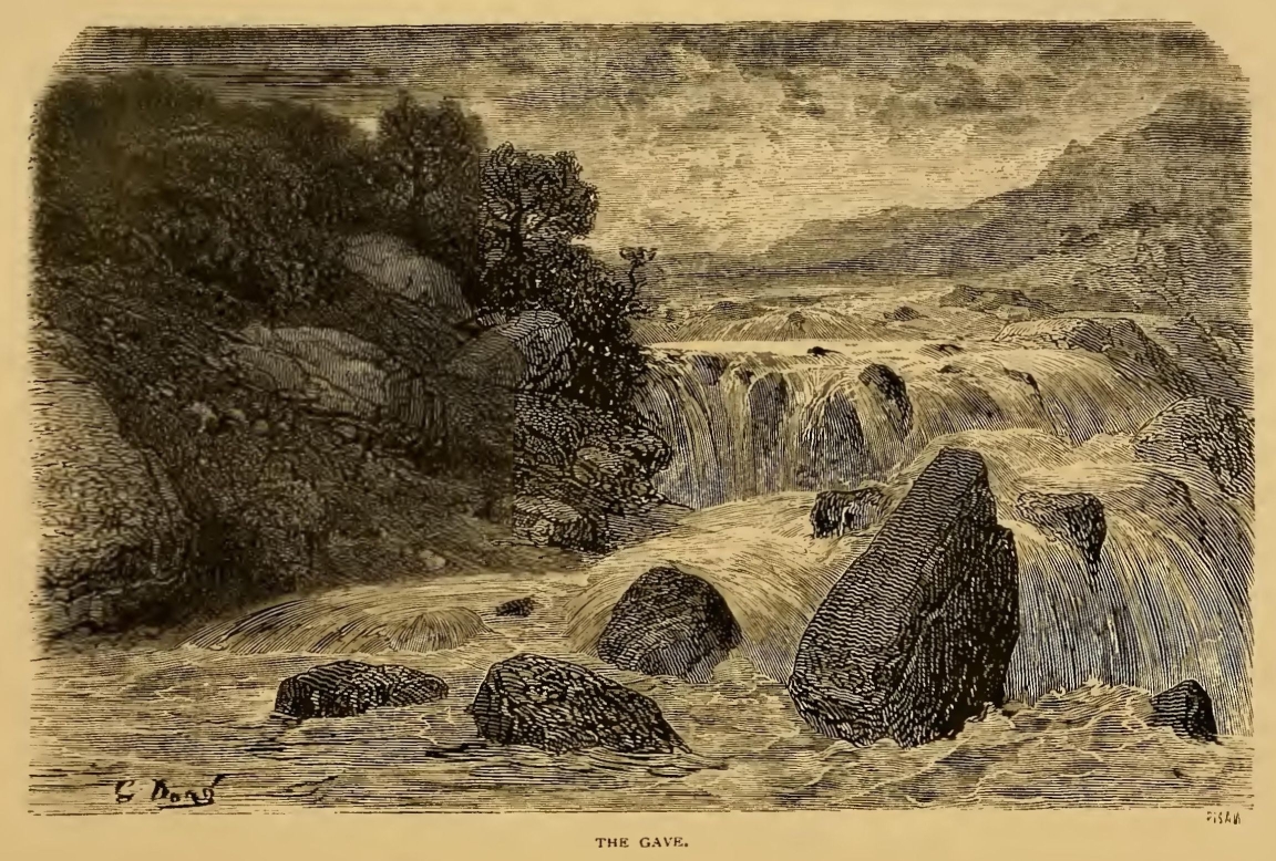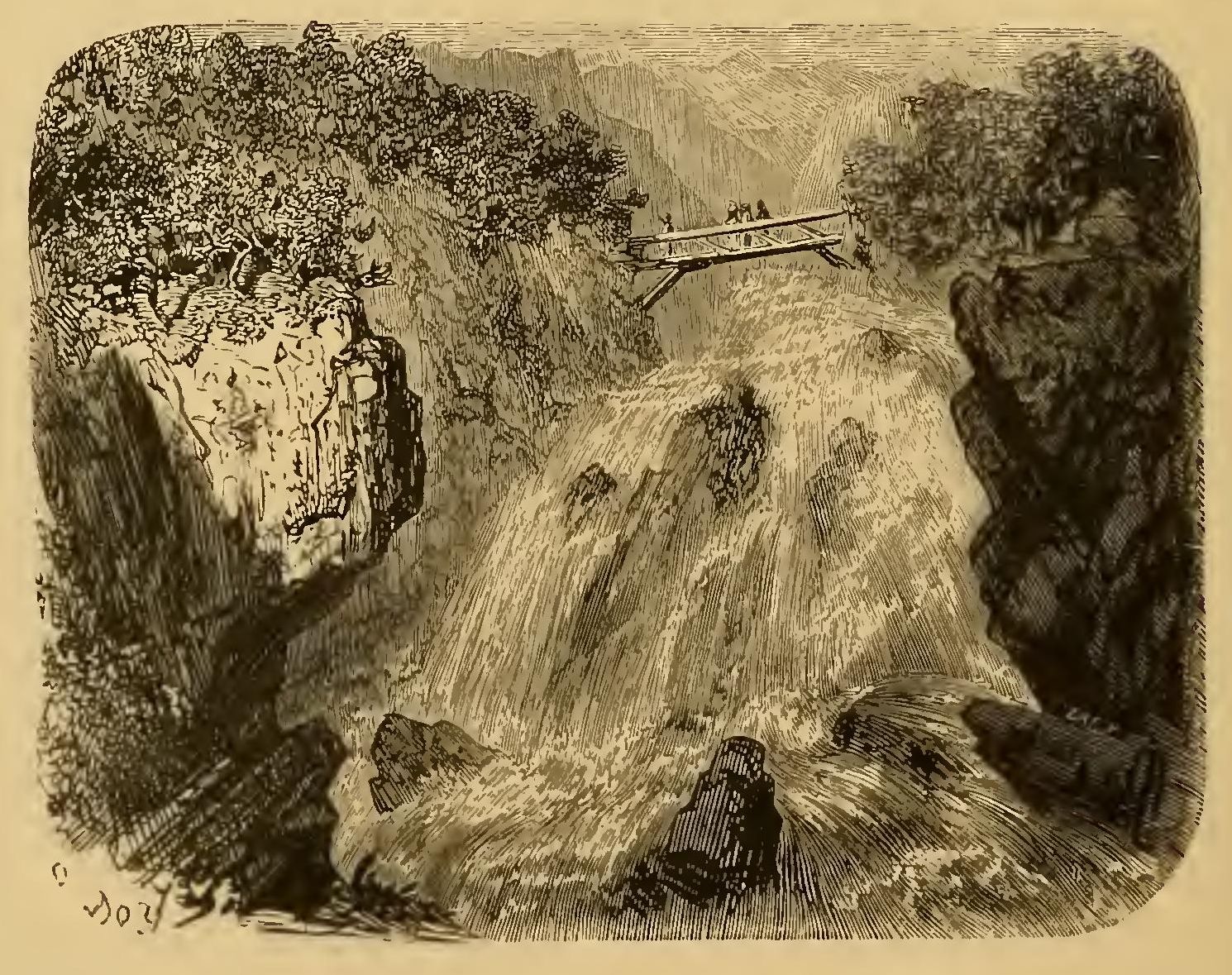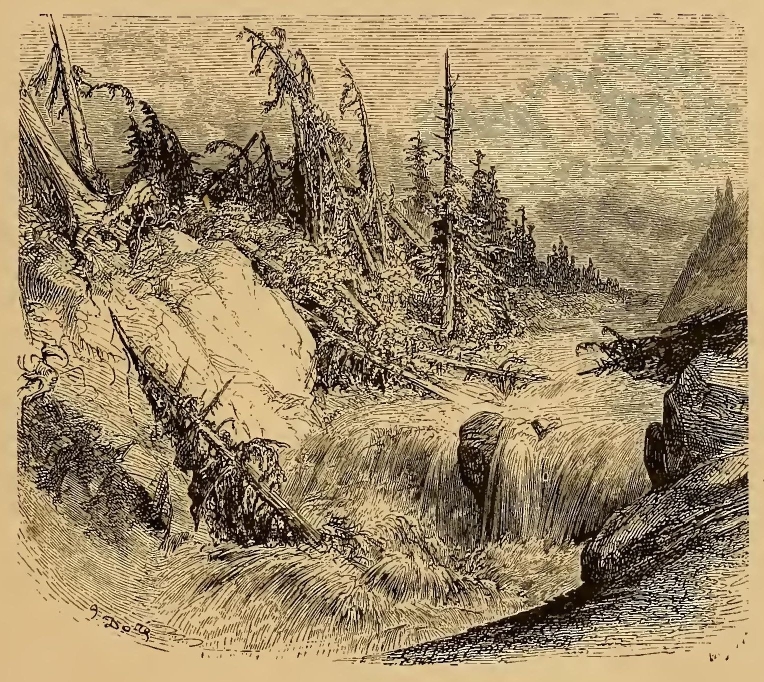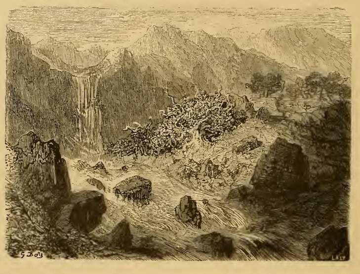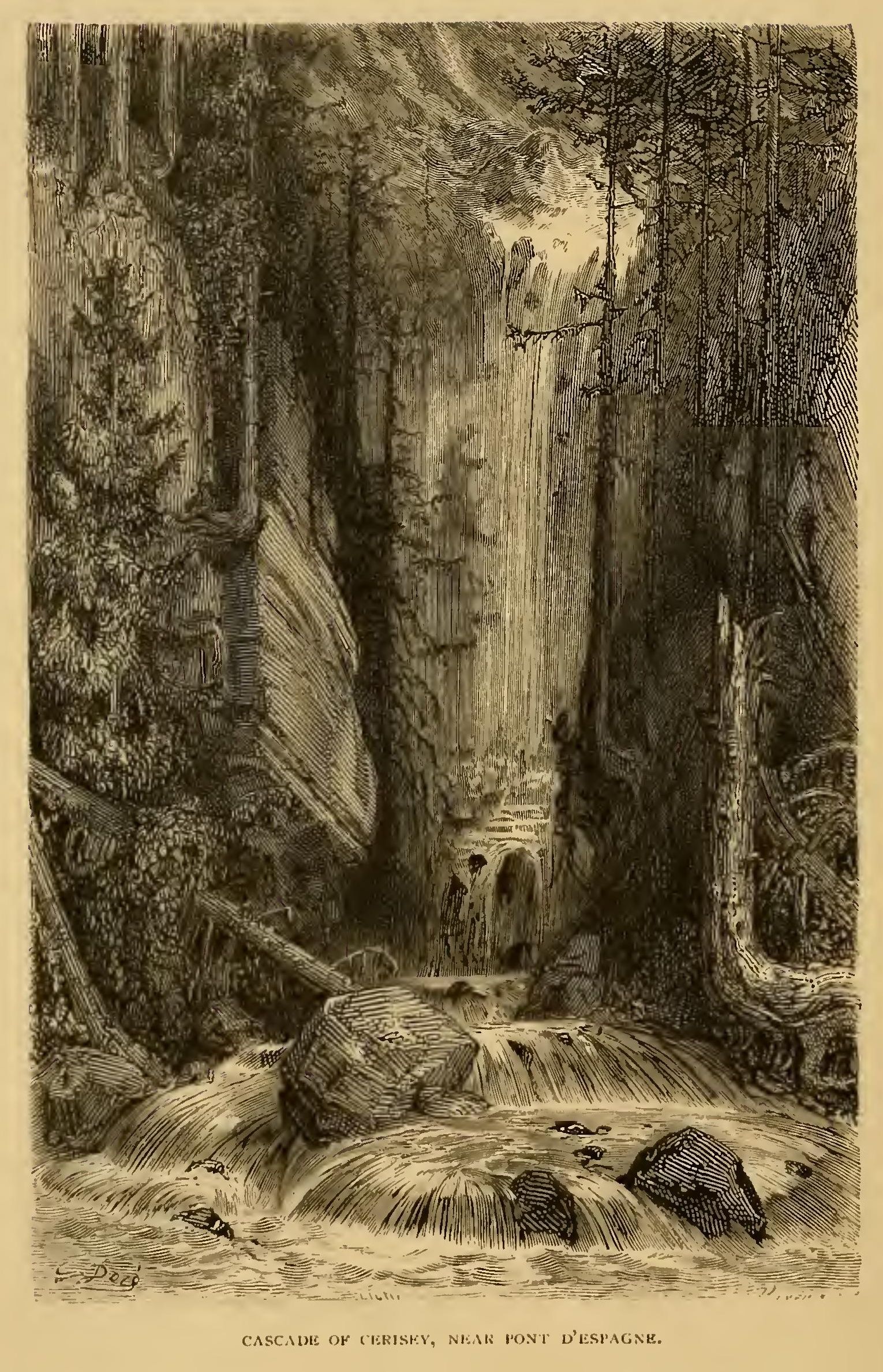 Toward the south the river becomes a torrent. Half a league from Luchon it is swallowed up in a deep defile of red rocks, many of which have fallen; the bed is choked with blocks; the two walls of rock close together in the north, and the dammed-up [497]water roars to get out of its prison; but the trees grow in the crevices, and along the wall the white flowers of the bramble hang in locks.