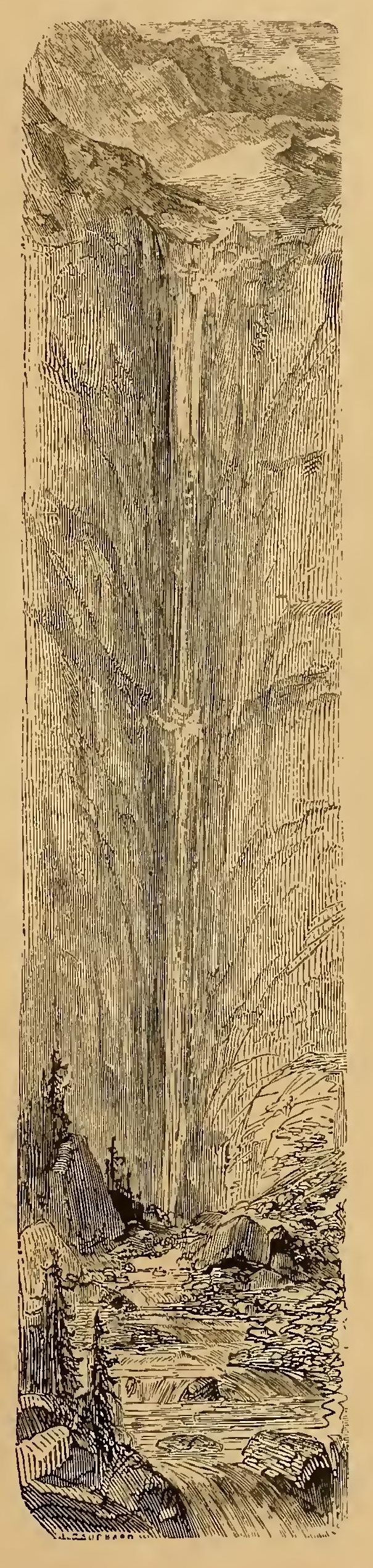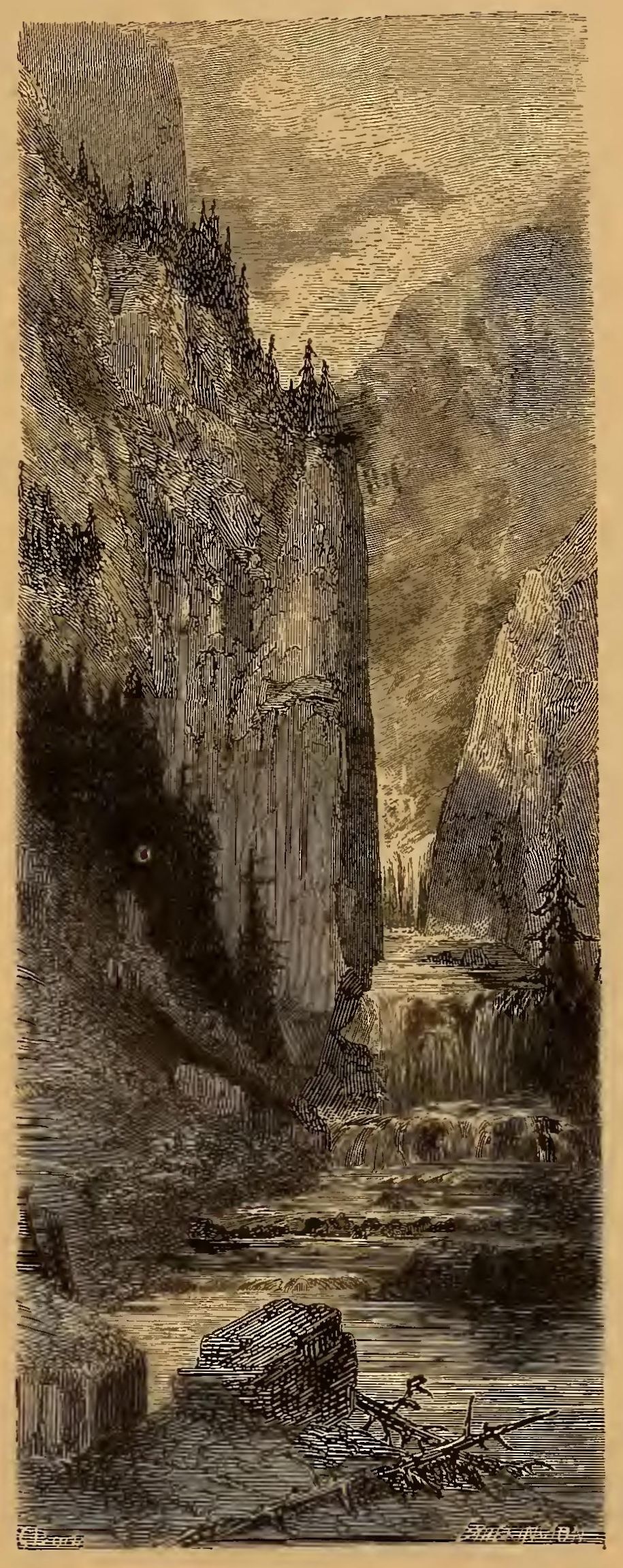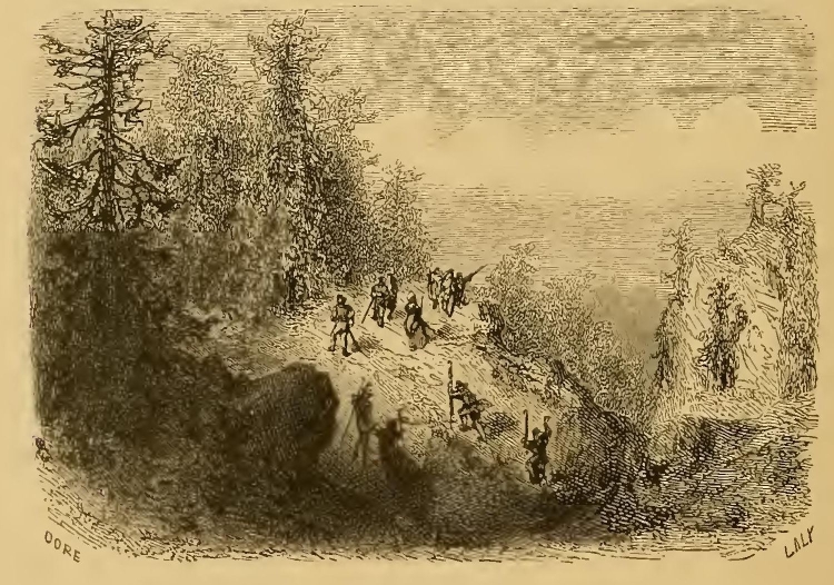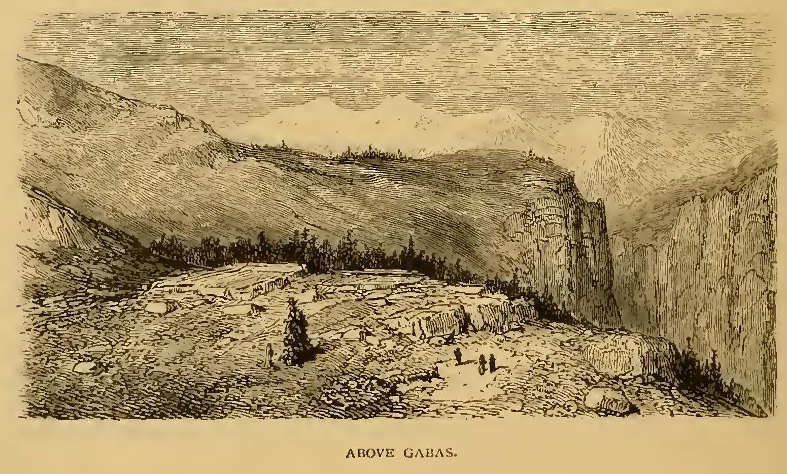 Toward the south the river becomes a torrent. Half a league from Luchon it is swallowed up in a deep defile of red rocks, many of which have fallen; the bed is choked with blocks; the two walls of rock close together in the north, and the dammed-up [497]water roars to get out of its prison; but the trees grow in the crevices, and along the wall the white flowers of the bramble hang in locks.