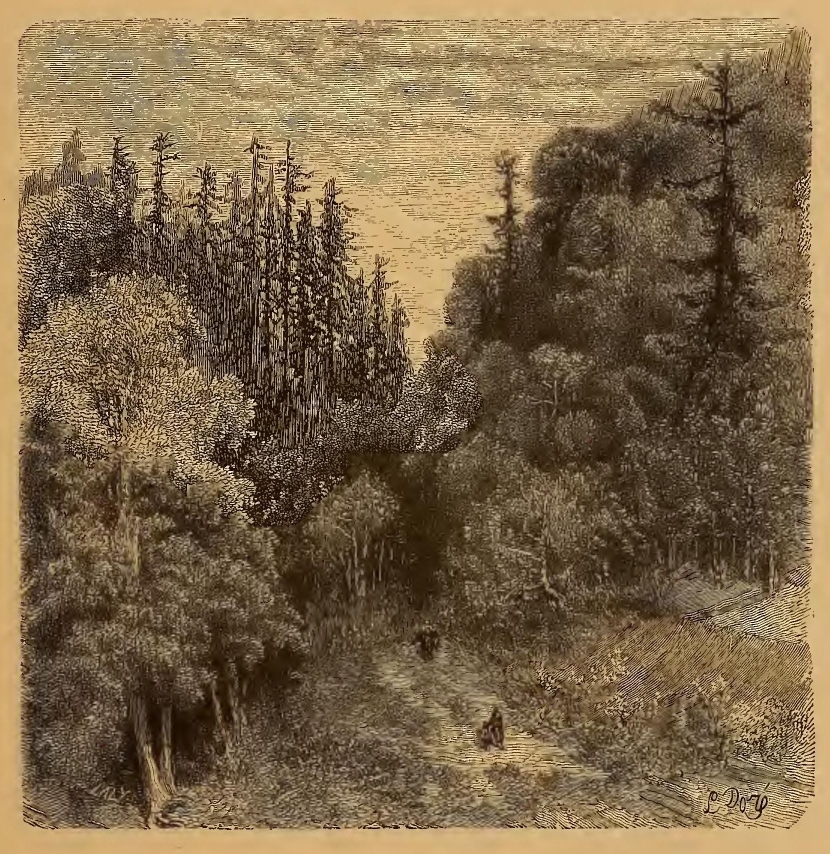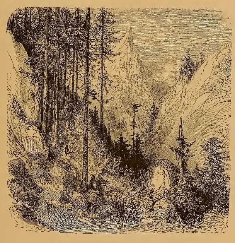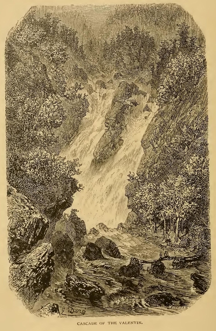The valley narrows and ascends; the Gave rolls between two slopes of great forests, and falls in a constant succession of cascades. The eyes are satiated with freshness and verdure; the trees mount to the very sky, thickset, splendid; the magnificent light falls like a rain on the immense slope; the myriads of plants suck it in, and the mighty sap that gorges them overflows in luxury and vigor. [499]