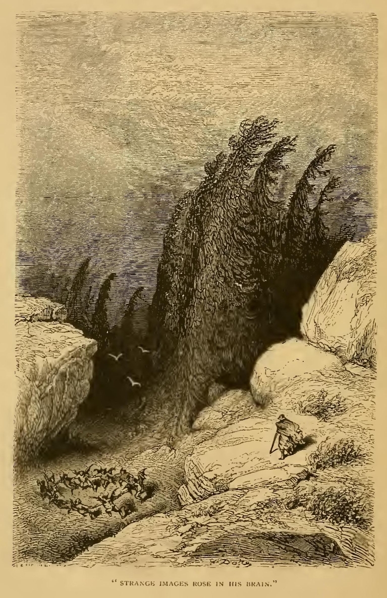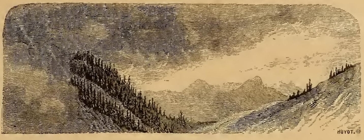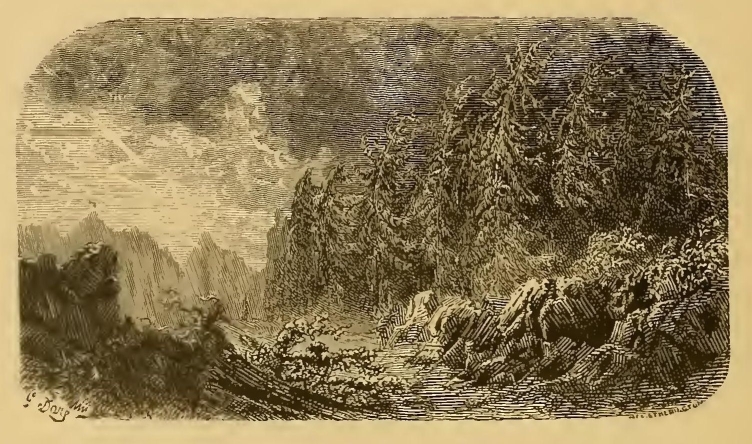 The day was declining, clouds dimmed the chilled sky. The woods, the fields, the mossy moors, the rocks of the slopes, took various hues in the waning light. But this opposition of hues, obliterated by distance and the greatness of the masses, melted into a green and grayish shade, of a melancholy and tender effect, like that of a vast wilderness half stocked with verdure. The shadows of the clouds travelled slowly, darkening the tawny summits. All [495]was in harmony, the monotonous sound of the wind, the calm march of the clouds, the waning of the day, the tempered colors, the softened lines.