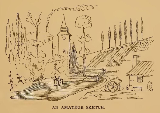 At the end of the alley a pretty chalet, like those in the Jardin des Plantes, shelters the du Pr’e spring. Its walls are a fantastic trellis of gnarled branches, adorned with their bark; its roof is thatched; its ceiling is a tapestry of moss. A [486]young girl sitting at the taps distributes to the bathers glasses of sulphurous water. The elegant toilettes come about four o’clock. Meanwhile you sit in the shade on benches of woven wood, and watch the children playing on the turf, the rows of trees descending toward the river, and the broad green plain, sprinkled with villages.