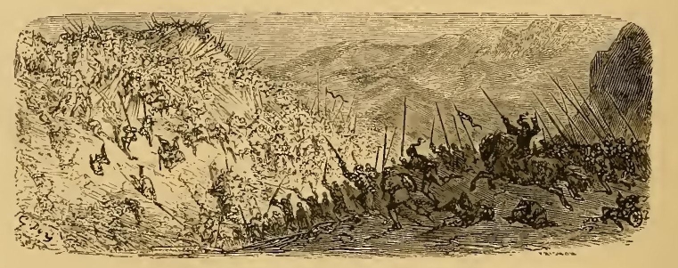 One of these feeling that his hair was moist, lifted his head, saw some little red streams running from between the joists of the ceiling, and began to laugh, saying that the greedy fellows up there could no [030]longer hold their cups, and were wasting good wine, which was very wrong of them. But finding that this wine was quite warm, he took some on his finger, then touched his tongue, and saw, by the insipid taste, that it was blood. He proclaimed this aloud, and the Bayonnais starting up grasped their pikes and ran for the staircase. Thereupon the Basques who had waited, not being sufficiently numerous, wished to recover the moment and rushed forth; but the first comers felt the point of the pikes, and were lifted, just as bundles of hay are spitted on the forks to be thrown into a loft; then the Bayonnais, holding themselves close together, and bristling in front with pikes, began to mount.