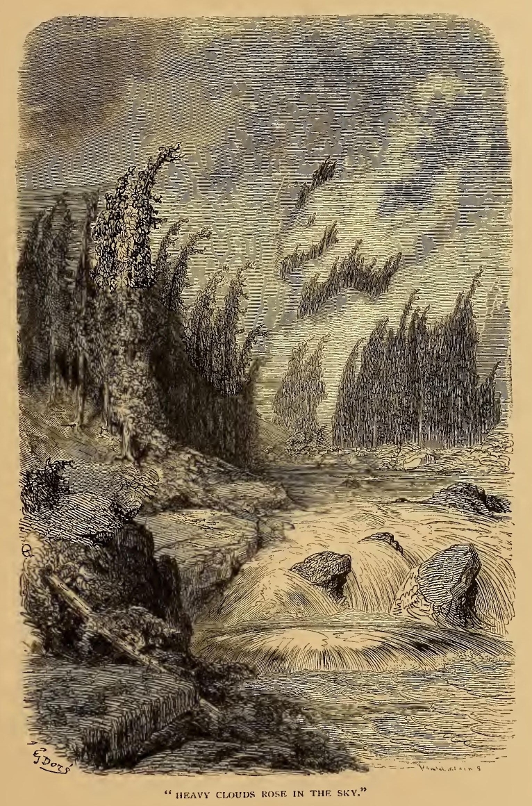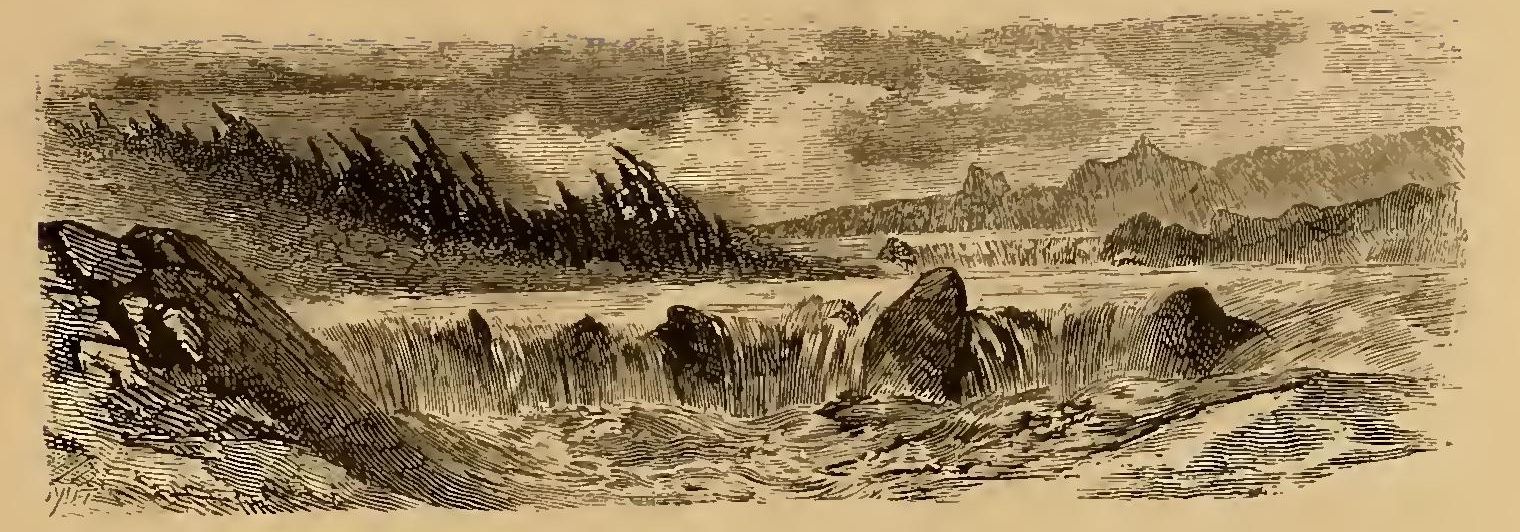 Indeed, at such moments it seems that the water must live and feel; it has a strange look, when it comes, transparent and sombre, to stretch itself upon a beach of pebbles; it turns about them as if uneasy and irritated; it beats them with its wavelets; it covers them, then retires, then comes back again with a sort of languid writhing and mysterious lovingness; its snaky eddies, its little crests suddenly beaten down or broken, its wave, sloping, shining, then all at once blackened, resembles the flashes of passion in an impatient mother, who hovers incessantly and anxiously about her children, and covers them, not knowing what she wants and what fears. Presently a cloud has covered the heavens, and the wind has risen. In a moment the river has assumed the aspect of a crafty and savage animal. It hollowed itself, and [005]showed its livid belly; it came against the keel with convulsive starts, hugged it, and dashed against it, as if to try its force; as far as one could see, its waves lifted themselves and crowded together, like the muscles upon a chest; over the flank of the waves passed flashes with sinister smiles; the mast groaned, and the trees bent shivering, like a nerveless crowd before the wrath of a fearful beast.