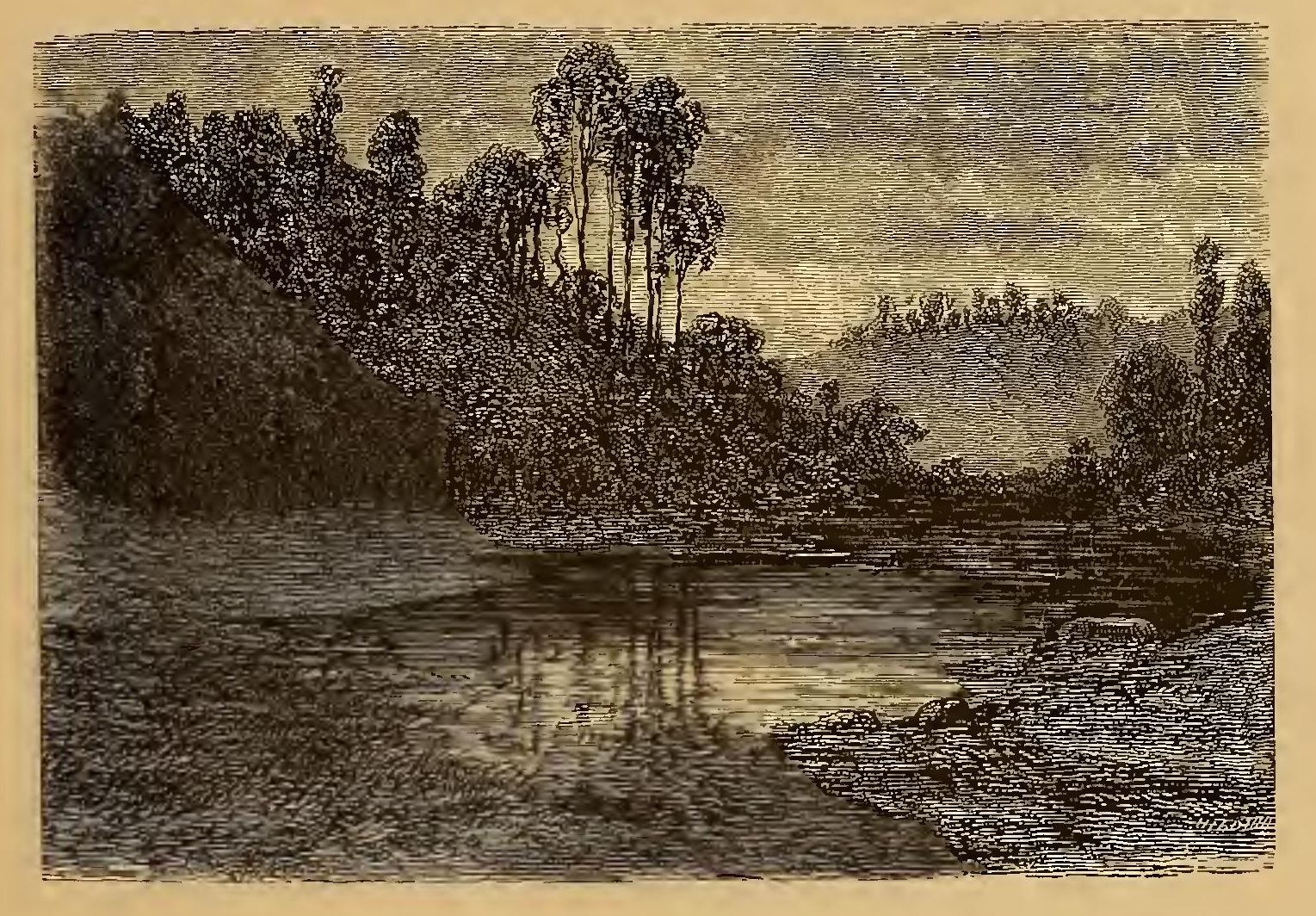 Night without a moon has come on. The peaceful stars shine like points of flame; the whole air is filled with a blue and tender light, which seems to sleep in the network of vapor wherein it lies. The eye penetrates it without apprehending anything. At long intervals, in this twilight, a wood confusedly marks its spot, like a rock at the bottom of a lake; everywhere around are vague depths, veiled and floating forms, indistinct and fantastic creatures melting into each other, fields that look like a billowy sea, clumps of trees that you might take for summer clouds,—the whole graceful chaos of commingled phantoms, of things of the night. The mind floats here as on a fleeting stream, and nothing seems to it real, in this dream, but the pools which reflect the stars and make on earth a second heaven.