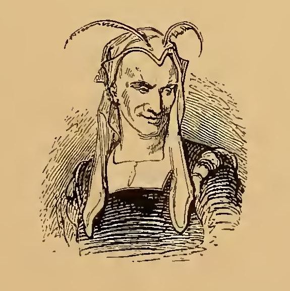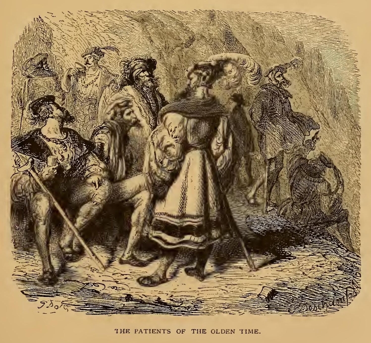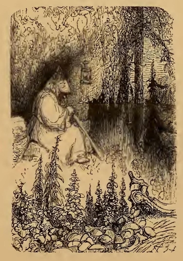 “Encausse,” say they, “is far from all commerce, and a man can have no other diversion in it than that of watching the return of his health. A small stream that, a score of paces away from the village, winds among willows and the greenest fields imaginable, was our only consolation. We used to go every morning to take our water in this pretty spot, and after dinner to walk there. One day when we were on the brink, seated on the grass, there came suddenly from the midst of the reeds that were nearest a man who had apparently been listening to us; it was an old man, all white, pale and lean, whose beard and locks hung below his girdle, such (an one) as Melchisedec is painted; or rather the figure is that of a certain old Greek bishop, who, with many a salaam, tells everybody’s fortune; for he wore a top-piece like a cauldron-lid, but of exceeding size, which answered him for a hat. And this hat, whose broad brim went drooping upon his shoulders, was made of branches of willow, and covered nearly all his body. His coat of greenish hue was woven of rushes, the whole [478]covered with great bits of a thick and bluish crystal.