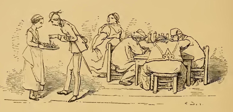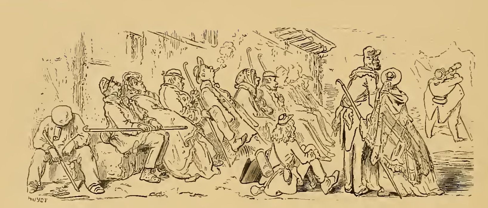The road ascends and descends, winding on high hills which denote the neighborhood of the Pyrenees. The sea reappears at each turn, and it is a singular spectacle, this suddenly lowered horizon, and that greenish triangle broadening toward [044]heaven. Two or three villages stretch along the route, their houses dropping down the heights like flights of stairs. From the white houses the women come out in black gown and veil to go to mass. The sombre color announces Spain. The men, in velvet vests, crowd to the public house and drink coffee in silence. Poor houses, a poor country; under a shed I have seen them cooking, in the guise of bread, cakes of maize and barley. This destitution is always touching. What is it that a day-laborer has gained by our thirty centuries of civilization? Yet he has gained, and when we accuse ourselves, it is because we forget history. He no longer has the small-pox, or the leprosy; he no longer dies of hunger, as in the sixteenth century, under Montluc; he is no longer burned as a witch, as happened indeed under Henry IV. here in this very place; he can, if he is a soldier, learn to read, become an officer; he has coffee, sugar, linen. Our descendants will say that that is but little; our fathers would have said that it is a good deal.
