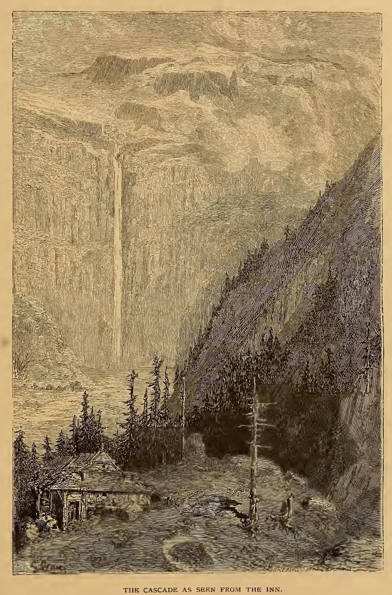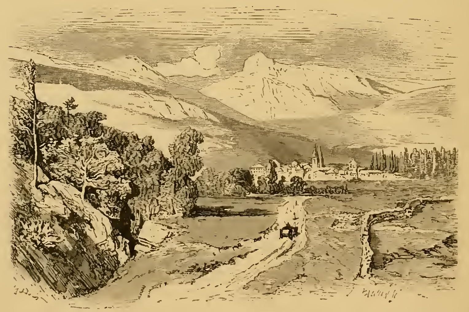 The road is bordered with vines, each of which carries up its tree, elm or ash, the crown of a fresh verdure, and lets its leaves and tendrils fall again in plumes. The valley is a garden long and narrow, between two chains of mountains. On the lower slopes are beautiful meadows where the living waters run in orderly fashion in trenches, nimble, prattling irrigators; the villages are seated [484]alone the little river; vine-stocks climb alone the dusty wall. The mallows, straight as tapers, lift above the hedges their round flowers, brilliant as roses of rubies. Orchards of apples pass continually on both sides of the coach; cascades fall in every hollow of the chain, surrounded with houses that seek a shelter. The heat and the dust are so terrible that they are obliged every time we pass a spring to sponge the nostrils of the horses. But at the end of the valley a mass of dark, rugged mountains lifts itself, with tops that are white with snow, feeding the river and closing the horizon. Finally, we pass beneath an alley of fine plane-trees, between two rows of villas, gardens, hotels, and shops. It is Luchon, a little city as Parisian as Bigorre. [485]