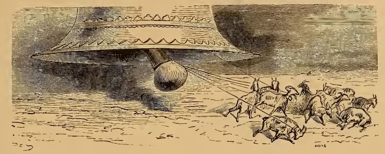 From the dike the tumult of the high tide was visible. A massive wall of black clouds girt the horizon; the sun blazed through a crevice like a fire through the mouth of a furnace, and overflowed [046]upon the billow its conflagration of ferruginous flames. The sea leaped like a maniac at the entrance of the harbor, smitten by a band of invisible rocks, and joined with its white line the two horns of the coast. The waves came up fifteen feet high against the beach, then, undermined by the falling water, fell head foremost, desperate, with frightful howling; they returned however to the assault, and mounted each minute higher, leaving on the beach their carpet of snowy foam, and fleeing with the slight shivering of a swarm of ants foraging among dry leaves. Finally one of them came wetting the feet of the men who were watching from the top of the dike. Happily, it was the last; the city is twenty feet below, and would be only a mass of ruins if some great tide were urged on by a hurricane.