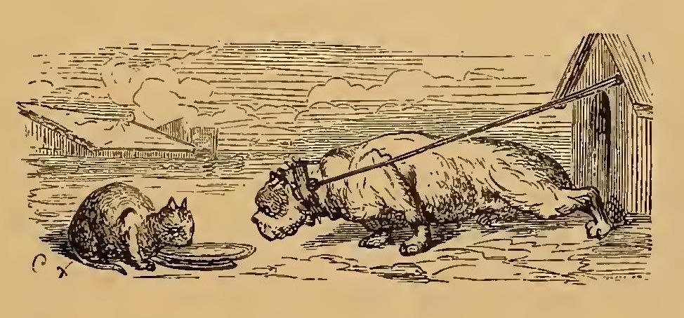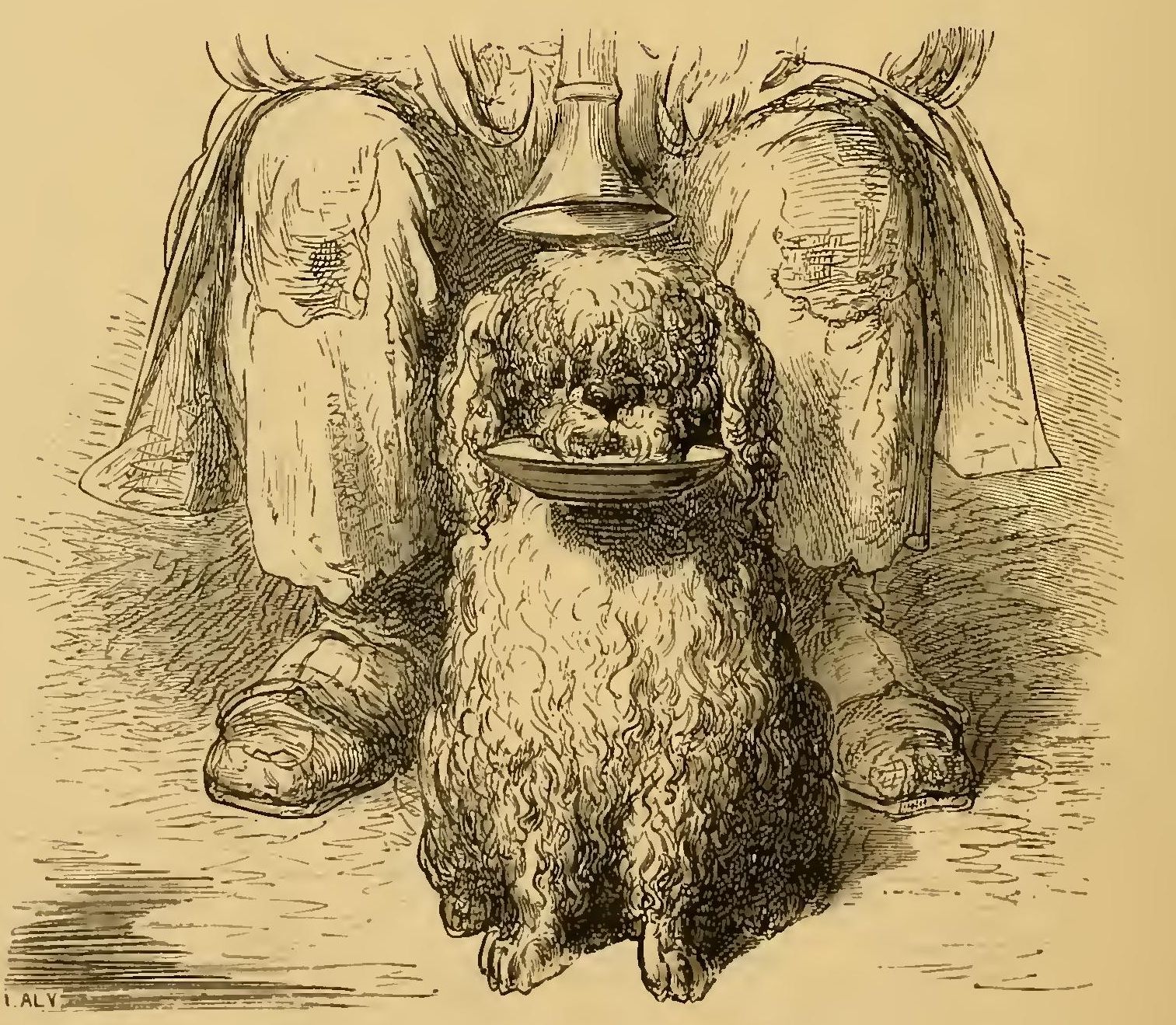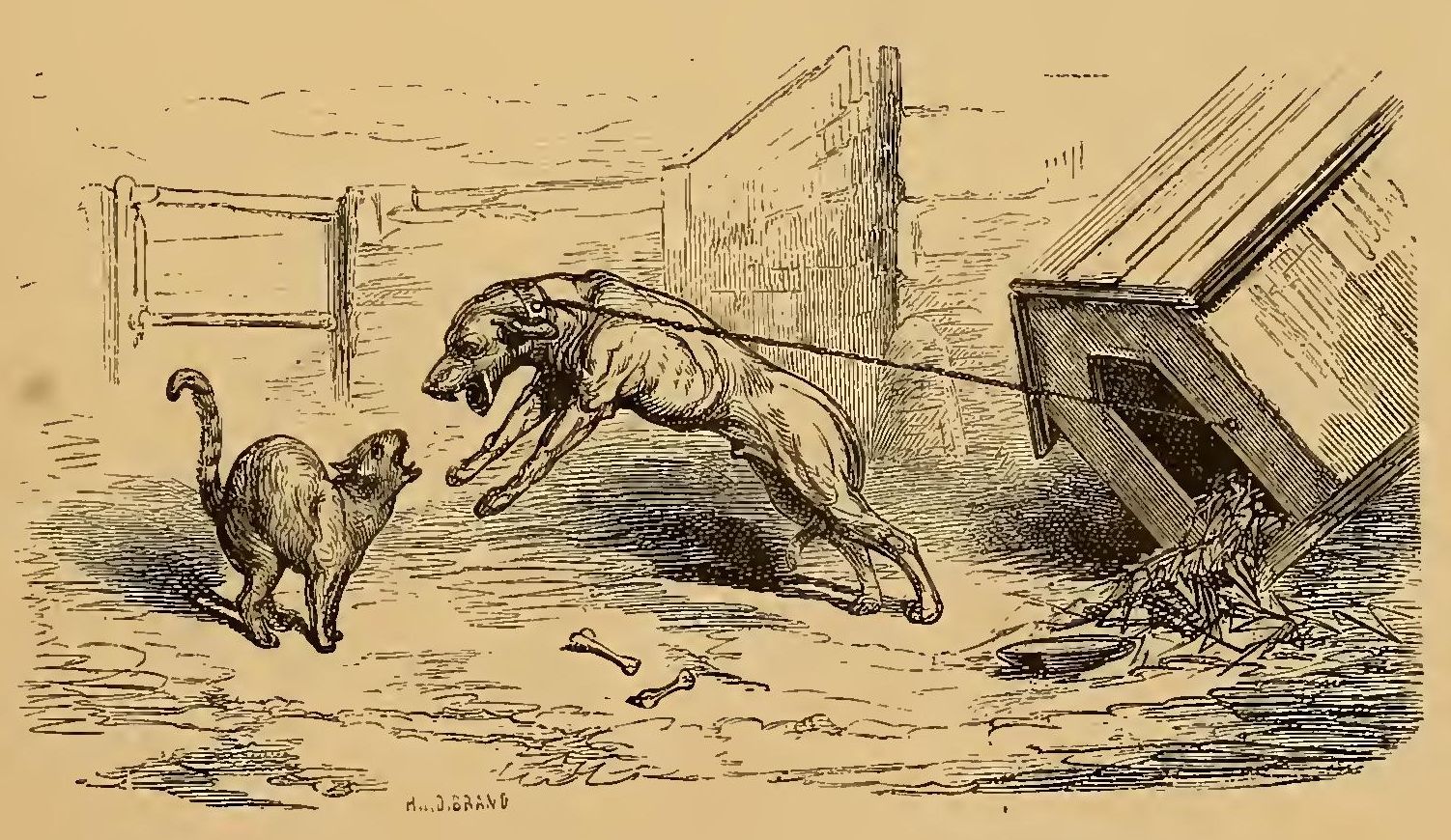 The dog is an animal so deformed, of such an unruly character, that from the earliest times it has been considered to be a monster, born and moulded in despite of all laws. Indeed, when rest is the natural state, how explain an animal that is forever in motion and busy, and that without aim nor need, even when he is gorged and not afraid? When beauty universally consists in suppleness, grace and prudence, how allow an animal to be forever brutal, howling, mad, jumping at the nose of people, running after kicks and rebuffs? When the favorite [463]and masterpiece of creation is the cat, how understand an animal that hates it, runs at it, without having received a single scratch from it, and breaks its ribs without any desire to eat its flesh?