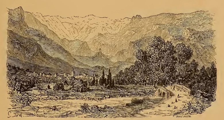 The valley is not a gorge, but a beautiful level meadow marked with trees and fields of maize, among which the river runs, but does not leap. Luchon is surrounded with alleys of plane-trees, poplars and lindens. You leave these alleys for a pathway which follows the waves of the Pique and winds amidst the high grass. The ashes and oaks form a screen along the two banks; big brooks come from the mountains; you cross them on trunks laid bridge-wise or on broad slabs of slate. All these waters [492]flow in the shade, between knotted roots which they bathe, and which form trellises on both sides. The bank is covered with hanging herbage; you see nothing but the fresh verdure and the dark waters. It is here that at noon the pedestrians take refuge; along the sides of the valley wind dusty roads where stream the carriages and the horsemen. Higher up, the mountains, gray or browned with moss, display their soft lines and noble forms as far as the eye can reach. They are not wild as at Saint Sauveur, nor bare as at Eaux-Bonnes; each of these chains advances nobly toward the city and behind it leaves its vast ridge to undulate to the very verge of the horizon.