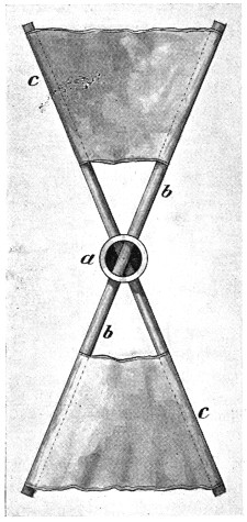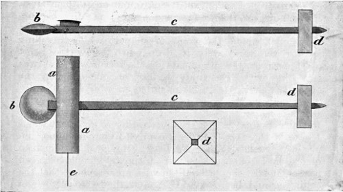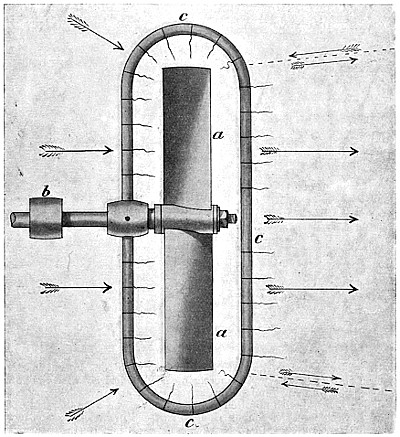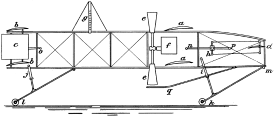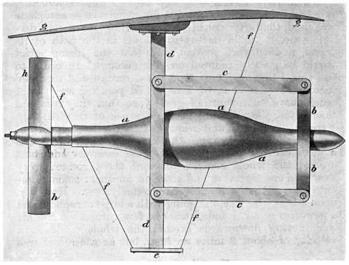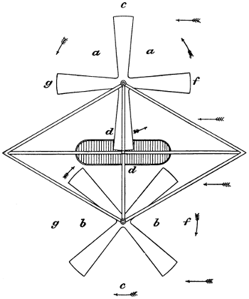 My father’s proposed machine, of which he made a sketch, was of the Hélicoptère type, having two screws both on the same axis—the lower one to be right hand and mounted on a tubular shaft, and the top one to be left hand and mounted on a solid shaft running through the lower tubular shaft. These screws were to be rotated in reverse directions by means of a small pinion engaging a bevel gear attached to each of the shafts. His plan contemplated large screws with very fine pitch, and he proposed to obtain horizontal motion by inclining the axis forward. He admitted that there was no motor in existence light enough, but thought one might be invented, and that an engine might be worked by a series of explosions in the cylinder, that is, what is known to-day as internal combustion; but he was not clear how such an engine could be produced. He, however, said that a flying machine would be so valuable in time of war, that it mattered little how expensive the explosive might be, even if fulminate of mercury had to be used. It is interesting to note in this connection that the great Peter Cooper of New York thought out an identical machine about the same time, and actually commenced experiments. It seems that this gentleman regarded fulminate of mercury[vi] as altogether too feeble and inert, because we find that he selected chloride of nitrogen as his explosive agent. However, his work was soon brought to an end by the loss of the sight of one eye, after which time he had no further dealings with this lively explosive.