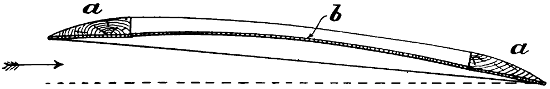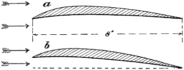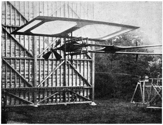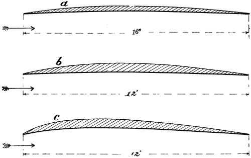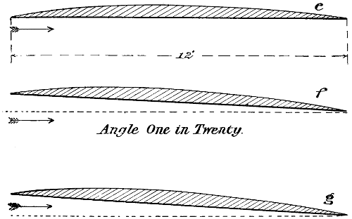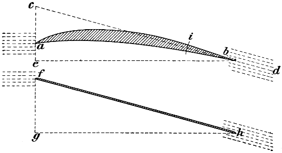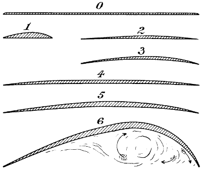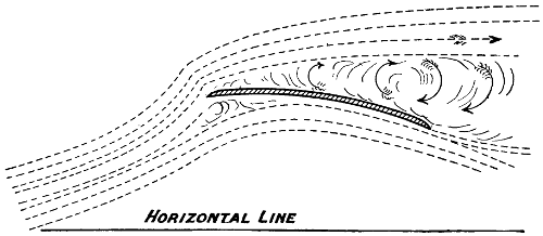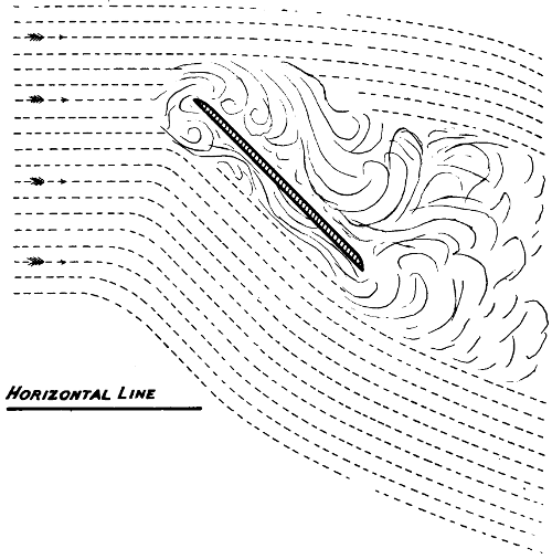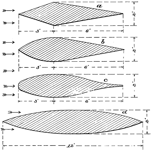 The many early conversations that I had with my father on the subject kept the matter constantly before me, and I think it was in 1872, after having seen Roper’s hot-air engine and Brayton’s petroleum engine, that I took the matter up, and commenced to make drawings of a machine of the Hélicoptère type, but instead of having one screw above the other, I saw at once that it would be much better if the two screws were widely separated, so that each would engage new air, the inertia of which had not been disturbed. The designing of the machine itself was a simple matter, but the engine gave me trouble. No matter from what point I examined the subject, the engine was always too heavy. It appears that the Brayton engine was shown at the Centennial Exhibition at Philadelphia in 1876, and that Otto visited this exhibition. Up to that time, he had been making a species of rocket engine—that is, an engine in which an explosive mixture shot the piston upward and then sucked it back, a rack and pinion transmitting movement to the rotating shaft by means of a pawl and ratchet. He appears to have been much interested in the Brayton engine, as it was evidently very much in advance of his own. It actually developed, even at that time, one horse-power per hour for every pound of crude petroleum consumed, but it was very heavy indeed, very difficult to start, and not always reliable. The shaft that worked the valve gear was parallel to the cylinder, and placed in the exact position occupied by a similar shaft in the present Otto engine, but instead of revolving only half as fast as the crank shaft, it made the same number of revolutions. On Otto’s return to Germany, he evidently profited by what he had seen, and made a new engine, which in reality was a cross between his own and the[vii] Brayton; the result was a very important invention, which has been of incalculable value to mankind. It is this engine which is now propelling our motor cars, and it is the only engine suitable for employment on a flying machine; but even this motor was not in a sufficiently high state of development as far as lightness was concerned, to be of any use to me. The drawings which I made in 1873, although of little or no value, kept my thoughts on artificial flight, and while I was away from home attending to business, especially when in foreign countries, I often amused myself by making mathematical calculations. Quite true, the formula which I used at the time—Haswell’s—was not correct; still, it was near enough to the mark to be of considerable value. Moreover, the error in this formula affected the Hélicoptère quite as much as the aeroplane system, and as I was working with the view of ascertaining the relative merits of the two systems, the error, although considerable, did not have any influence at all in the decision which I arrived at—namely, that the aeroplane system was the best. The machine that I thought out at that time contemplated superposed aeroplanes of very great length from port to starboard. The size in the other direction was more for the purpose of preventing a rapid fall than for a lifting effect. I saw that it would be necessary to have horizontal fore and aft rudders placed a long distance apart, so as to prevent rapid pitching, and it appeared to me that the further these rudders were apart, the easier it would be to manœuvre the machine. As I never had any doubts regarding the efficiency of screw propellers working in the air, I decided to use two of these of a large size rotating in opposite directions. Of course, all this speculation was theory only, but I verified it later on by actual experiments before I built my machine, and it is very gratifying to me to know that all the successful flying machines of to-day are built on the lines which I had thought out at that time, and found to be the best. All have superposed aeroplanes[viii] of great length from port to starboard, all have fore and aft horizontal rudders, and all are driven with screw propellers. The change from my model is only a change in the framework made possible by dispensing with the boiler, water tank, and steam engine. In this little work, I have dealt at considerable length with air currents, the flight of birds, and the behaviour of kites, perhaps at the expense of some repetitions; as the resemblance between kite flying and the soaring of birds is similar in many respects, repetitions are necessary. To those who go to sea in ships, it is necessary to know something of the currents they are liable to encounter; if it be a sailing ship, certainly a knowledge of the air currents is of the greatest importance, and so it is with flying machines. If flights of any considerable distance are to be made, the machine is liable at any time to encounter very erratic air currents, and it has been my aim in discussing these three subjects—air currents, birds, and kites—to bring them before the would-be navigators of the air, in order that they may anticipate the difficulties they have to deal with and be ready to combat them. Then, again, there has been almost an infinite amount of discussion regarding the soaring of birds and the flying of kites. Many years ago, after reading numerous works on the subject of flight, I became a close observer myself, and always sought in my travels to learn as much as possible. I have attempted to discuss this subject in simple and easily understood language, and to present sufficient evidence to prevent the necessity of any further disputes. I do not regard what I have said as a theory, but simply as a plain statement of absolute and easily demonstrated facts. During the last few years, a considerable number of text-books and scientific treatises have been written on the subject of artificial flight, the most elaborate and by far the most reliable of these being the “Pocket-Book of Aeronautics,” by Herman W. L. Moedebeck, Major und Battaillonskommandeur im Badischen Fussartil