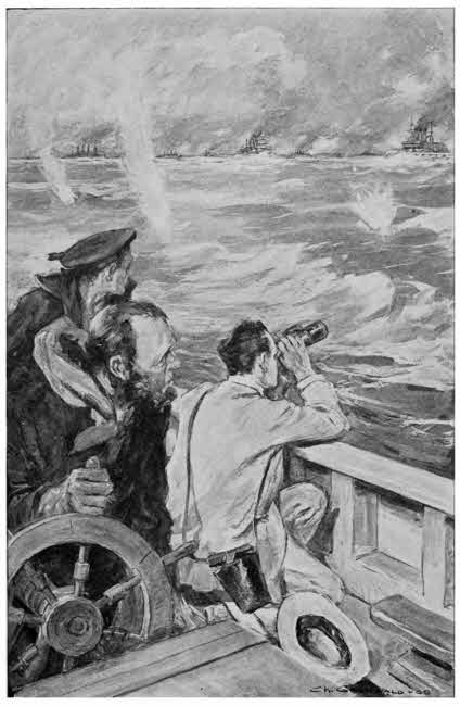 “Out there! Right out there!” I shouted. “Come!” and throwing open the door, I rushed towards the beach, followed by the others. I pointed to the mass of wreckage rising and falling on the tide. “There! there!” I shouted. “He just destroyed that yacht.”