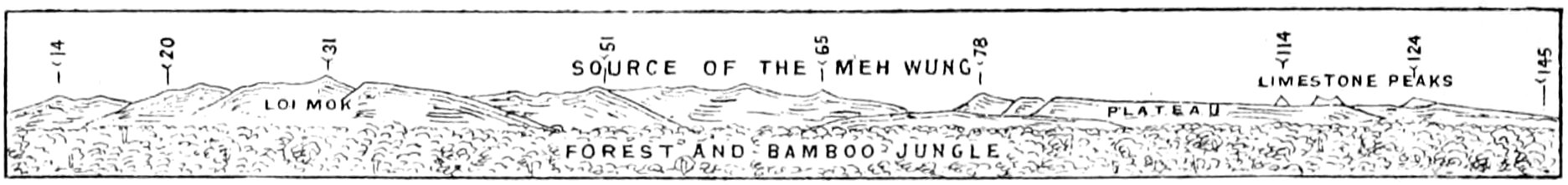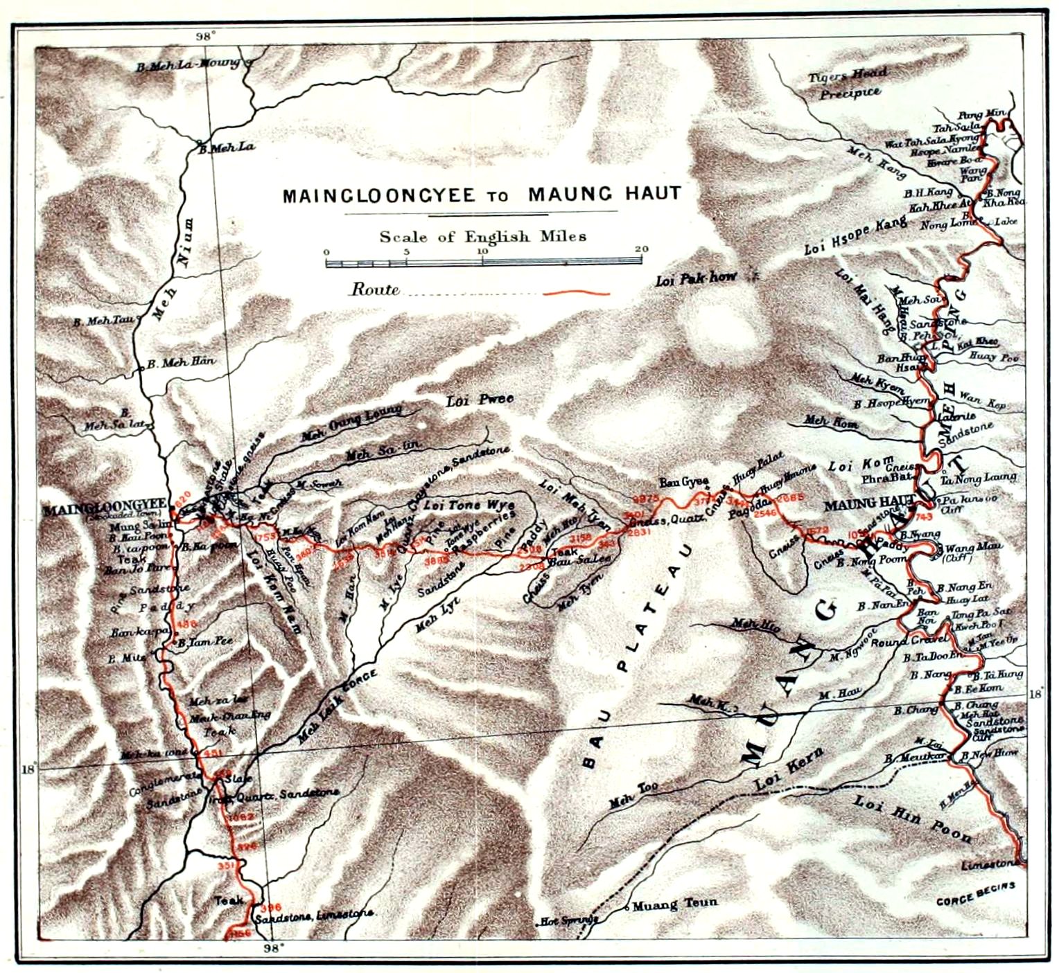 | A Chinese fortification—Chinese army destroyed by famine—Viang Pa Pow—Kiang Tung Lawas—Witch villages—An intelligent prince—Best direction for railway—Purchase an ox for food—An ancient lake—Leave Pa Pow—Upper gorge of the Meh Low—Kiang Tung Lawas a Jung tribe, and distinct from Bau Lawas—Burmese Shans—Cattle with nose-bags and masks—Effect of soil on foliage—Surprises in the jungle—Temple at Bau Meh Pik—Offerings to deceased ancestors—The valley of the Meh Sooay a game-preserve—Indications of gold—Road to Viang Pow—Lower gorge of the Meh Low—Portow, the little elephant’s playmate—Loi Kook—Loi Chang Shans returning from frontier duty—Unwarrantable action of Chinese general—Kiang Hung Shans Burmese subjects in 1886—Removal of capital—Kiang Hung annexed by British in 1888—Shans dread entering deserted temples—Deceased monks classed as demons—Worshipping deceased monks—Suicide of a princess and two of her maids—Soused by an elephant—Courtesy of the Chow Hona of Kiang Hai—An immense plain, | 142 |