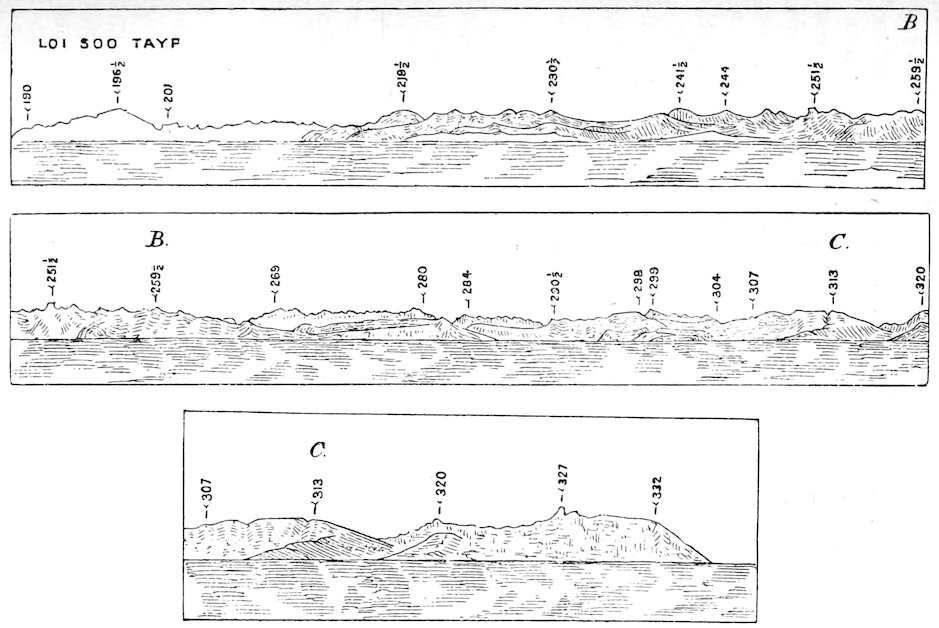 | Paying for supplies—Land and teak-forests belong to chiefs—Land rent—Light taxation—Leave Muang Doo—Upper Meh Hkuang—Ascend a plateau—A surprise—Luong Hkort—The Meh Hkort—Pass between the drainage of the Meh Ping and Meh Kong—Precaution against demons—Shans will not travel alone—A scare for tigers—Head-dressing and tattooing of Zimmé Shans—Charms let in the flesh—A quiet race—Villagers responsible for loss and crime in neighbourhood—Must not leave village without permission—Surveying under difficulties—The little elephant’s fun—The Meh Wung and Meh Ping—A vast plain depopulated—Timidity of elephants—Residence for demons—Reach Viang Pa Pow, | 133 |