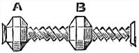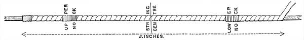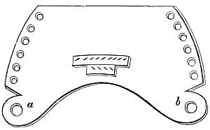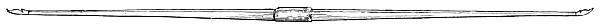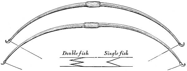 The self-yew bow may be a single-stave—that is to say,[8] made of a single piece of wood, or may be made of two pieces dovetailed or united in the handle by what is called a fish. In a single-stave bow the quality of the wood will not be quite the same in the two limbs, the wood of the lower growth being denser than that of the upper; whilst in the grafted bow, made of the same piece of wood, cut or split apart, and re-united in the handle, the two limbs will be exactly of the same nature. The joint, or fishing (fig. 7), should be double, not single. The difference, however, between these two sorts of self-yew bows is so slight as to be immaterial. In any unusually damp or variable climate single staves should be prepared; and in the grafted bows care should be taken in ascertaining that they be firmly put together in the middle. A single-stave bow has usually a somewhat shorter handle, as it becomes unnecessary to cover so much of the centre of the bow when the covering is not used as a cover to the joint, but for the purpose of holding the bow only.