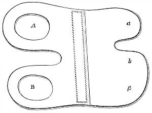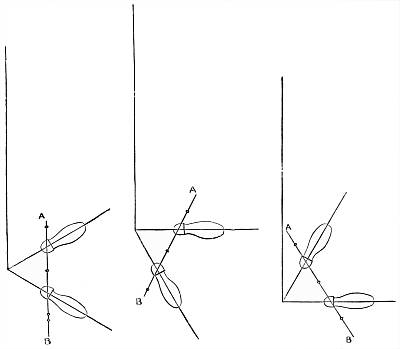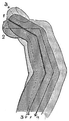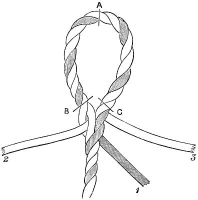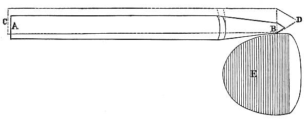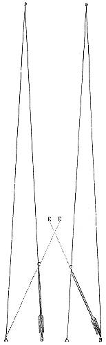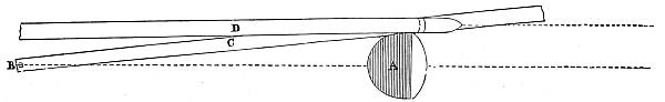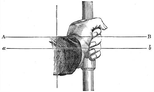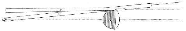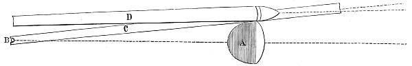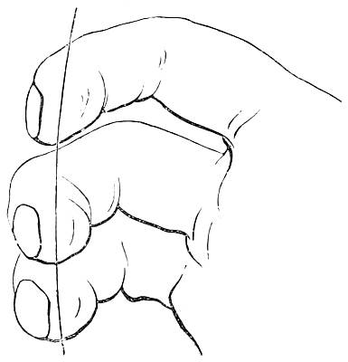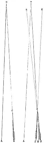 It must be observed that the nock of the arrow being constrained to move, as it does move in the last case, causes a pressure of the arrow upon the bow (owing to its slanting position on the bow, and its simultaneous rapidity of passage), and therefore a reacting pressure of the bow upon the arrow. This makes the bow have quite a different effect upon the deviation from what it had in the first case, when the arrow moved slowly and gradually upon the bow (being held by the nock), the obstacle presented by the half-breadth of the bow[30] then causing a deviation wholly to the left. The pressure now considered, however, has a tendency to cause deviation to the left only during the first part of the arrow's passage upon the bow, whilst during the second part it causes a deviation to the right; or, more correctly speaking, the pressure of the bow upon the arrow has a tendency to cause a deviation to the left so long as the centre of gravity of the arrow is within the bow, and vice versâ. So that, if this were the only force acting upon the arrow, its centre of gravity (this is, of course, the point upon which the arrow, balanced horizontally, will poise) should lie midway in that part of the arrow which is in contact with the bow during the bow's recoil. There is another force which contributes towards this acting and reacting pressure between the arrow and the bow at the loose if the nocking-place of the string be properly fitted to the arrow, but not otherwise. As the fingers are disengaged from the string they communicate a tendency to spin to the string, and this spin immediately applies the arrow to the bow if it should happen to be off the bow through side-wind or that troublesome failing of beginners and others of a crooked pinch between the fingers upon the nock of the arrow. It will be observed that if the nocking-place be too small to fill the nock of the arrow this tendency to spin in the string will not affect the replacement of the arrow; but if the nocking-place be a good fit to the nock, the former must be a trifle flattened, and so communicate the spin of the string to the arrow in the shape of a blow upon the bow. It is not pretended that no arrow will fly straight unless the nocking-place fit the arrow. If the string be home in the nock the shot will still be correctly delivered, because the very close and violent pressure of the string on the nock will arrest the spin and so apply the arrow; but if the string be not home in the nock at the delivery of the loose, there is great danger that the nock will be broken, either from the nocking-place being too small, or from the other fault of its being too big. It is this spin given to the string as the[31] arrow is loosed that necessitates the delivery of the arrow from the other side of the bow when the thumb-loose of the Oriental archer is employed, because this loose communicates the same spin, but reversed, to the string.