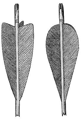 The arrow is perhaps the most important of all the implements of the archer, and requires the greatest nicety of make and excellence of materials; for, though he may get on without absolute failure with an inferior bow or other tackle, unless the arrow be of the best Robin Hood himself would have aimed in vain. Two things are essential to a good arrow, namely, perfect straightness, and a stiffness or rigidity sufficient to stand in the bow, i.e. to receive the force of the bow as delivered by the string without flirting or gadding; for a weak or supple is even worse than a crooked arrow—and it need hardly be said how little conducive to shooting straight is the latter. The straightness of the arrow is easily tested by the following simple process. Place the extremities of the nails of the thumb and middle finger of the left hand so as just to touch each other, and with the thumb and same finger of the right hand spin the arrow upon the nails at about the arrow's balancing-point; if it revolve truly and steadily, keeping in close and smooth contact with the nails, it is straight; but if it jump in the very least the contrary is the case. In order to test its strength or stiffness the arrow must be held by the nock, with its pile placed on some solid substance. The hand at liberty should now be pressed downwards on the middle of the arrow. A very little experience as to whether the arrow offer efficient resistance to this pressure will suffice to satisfy the archer about its stiffness. An arrow that is weaker on one side than on the other should also be rejected.