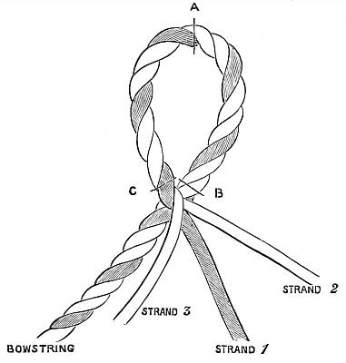 To increase or diminish the power of a bow, it is usual to shorten it in the former case, and to reduce the bulk in the latter; but to shorten a bow will probably shorten its life too, and mayhap spoil it, unless it be certain that it is superfluously long or sufficiently strong in the handle. On the other hand, to reduce a bow judiciously, if it need to be weaker, can do it no harm; but the reduction should not be carried quite up to the handle. It is a good plan to choose a bow by quality, regardless of strength, and have the best bow that can be procured reduced to the strength suitable. In all cases the horns should be well and truly set on, and the nocks should be of sufficient bulk to enclose safely the extremities of the limbs of the bow running up into them, and the edges of the nocks should be made most carefully smooth. If the edge of the nock be sharp and rough, the string must be frayed, and in consequence break sooner or later, and endanger the safety of the bow. The lower nock is not unfrequently put on or manufactured a trifle sideways as to its groove on the belly side. This is done with a view to compensate the irregularity of the loop: but this is a mistake, as it is quite unnecessary in the case of a loop, and must be liable to put the string out of position when there is a second eye to the string—and this second eye every archer who pays due regard to the preservation of his bows and strings should be most anxious to adopt as soon as possible.