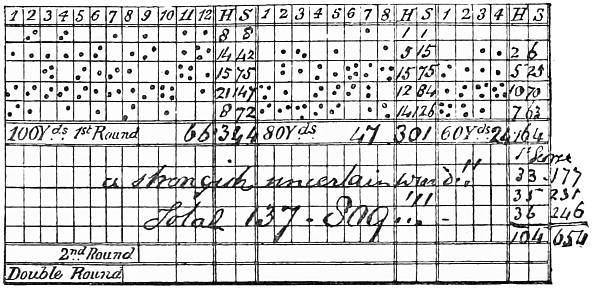 and on October 5, 1876, at 60 yards, 24 hits with 160 score—'record' for 60 yards shooting in the York Round at the meetings of the Royal Toxophilite Society.