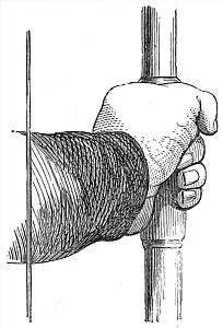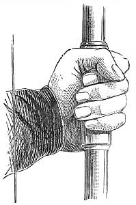 The handle of the bow, which in size should be regulated to the grasp of each archer, should be in such a position that the upper part of it may be from an inch to an inch and a quarter above the true centre of the bow, or the point in the handle whereon the bow will balance. If this centre be lower down in the handle, as is usual in bows of Scotch manufacture,[9] the cast of the bow may be somewhat improved, but at the cost of a tendency to that unpleasant feeling of kicking and jarring in the hand. Again, if the true centre be higher, or, as is the case in the old unaltered Flemish bows, at the point where the arrow lies on the hand, the cast will be found to suffer disadvantageously. If the handle be properly grasped (inattention to which will endanger the bow's being pulled out of shape), the fulcrum, in drawing, will be about the true balancing centre, and the root of the thumb will be placed thereon. Considering a bow to consist of three members—a handle and two limbs—the upper limb, being somewhat longer, must of necessity bend a trifle more, and this it should do. The most usual covering for the handle is plush; but woollen binding-cloth, leather, and india-rubber are also in constant use.