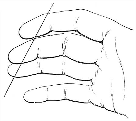 In shape all bows should be full and inflexible in the centre, tapering gradually to each horn. They should never bend in the handle, as bows of this shape (i.e. a continuous curve from horn to horn) always jar most disagreeably in the hand. A perfectly graduated bend, from a stiff unbending centre of at least nine inches, towards each horn is the best. Some self-yew bows are naturally reflexed, others are straight, and some follow the string more or less. The slightly reflexed bows are perhaps more pleasing to the eye, as one cannot quite shake off the belief that the shape of Cupid's bow is agreeable. Bows which follow the string somewhat are perhaps the most pleasant to use.