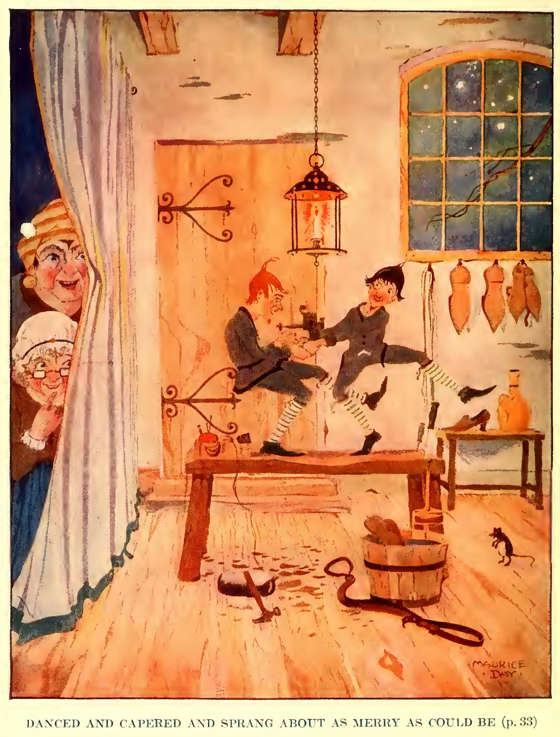 At this the robber ran back to his comrades, as fast as his legs could carry him. He told them that a horrid witch had got into the house, and had spit at him, and scratched his face with long bony fingers. A man with a knife in his hand hid behind the door, and stabbed him in the leg. A black monster stood in the yard, and struck him with a club. And the judge sat upon the top of the house, and cried out:—