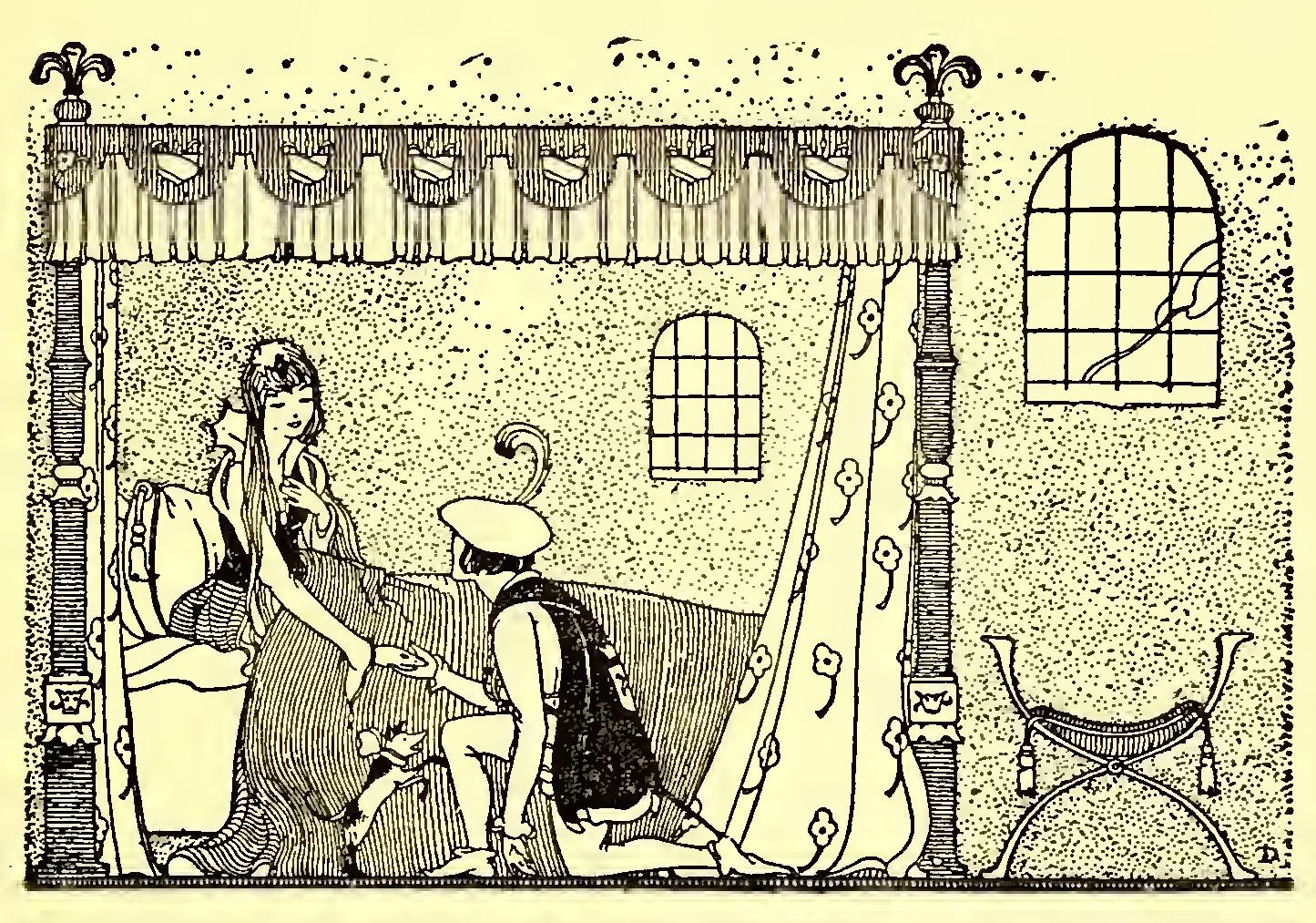 “I meant to climb down the ladder, but before I could do so my lover had climbed up. He leaped in at my window. At first I was frightened, but then I was glad to have him with me. He gave me a picture of himself, but while we were talking the fairy Violent flew in at the window on the back of the dragon. She was in a great rage, and bade the dragon at once devour my lover.