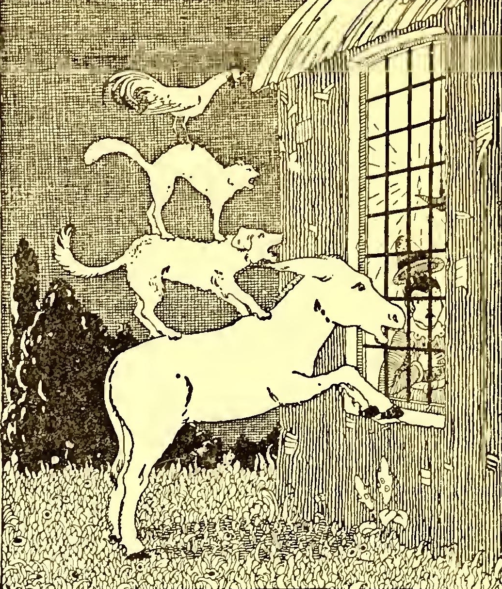 “Yes,” said the Ass, “if we only could get in.” So they all talked the matter over, and at last hit upon a plan. The Ass stood on his hind-legs, with his fore-feet resting on the window-sill; the Dog got upon his back; the Cat scrambled up to the Dog’s shoulders; and the Cock flew up and sat upon the Cat’s head.
